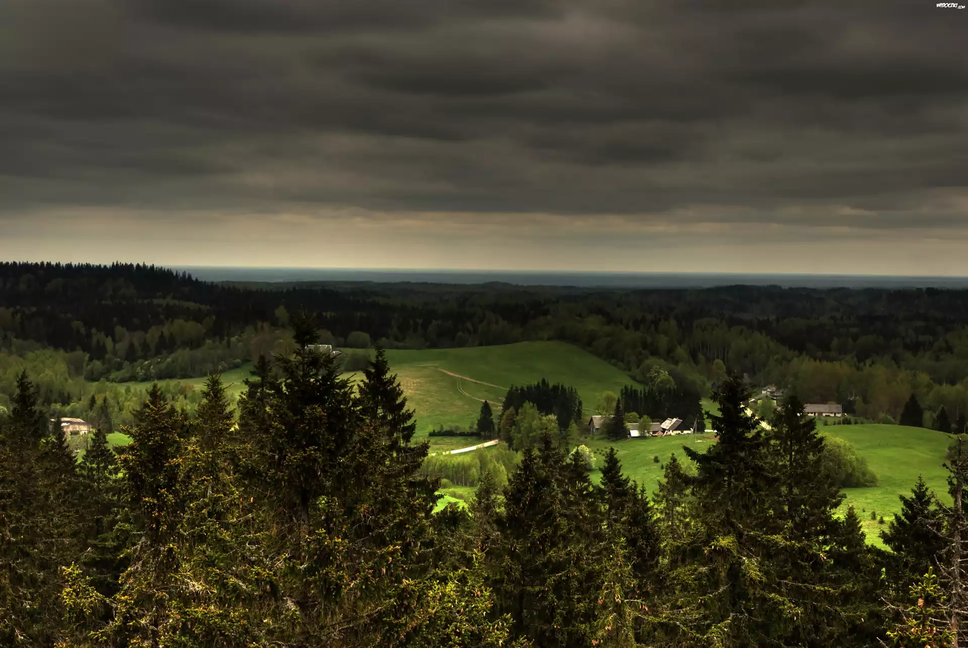 Panorama, Las, Łąka, Wieś, Chmury
