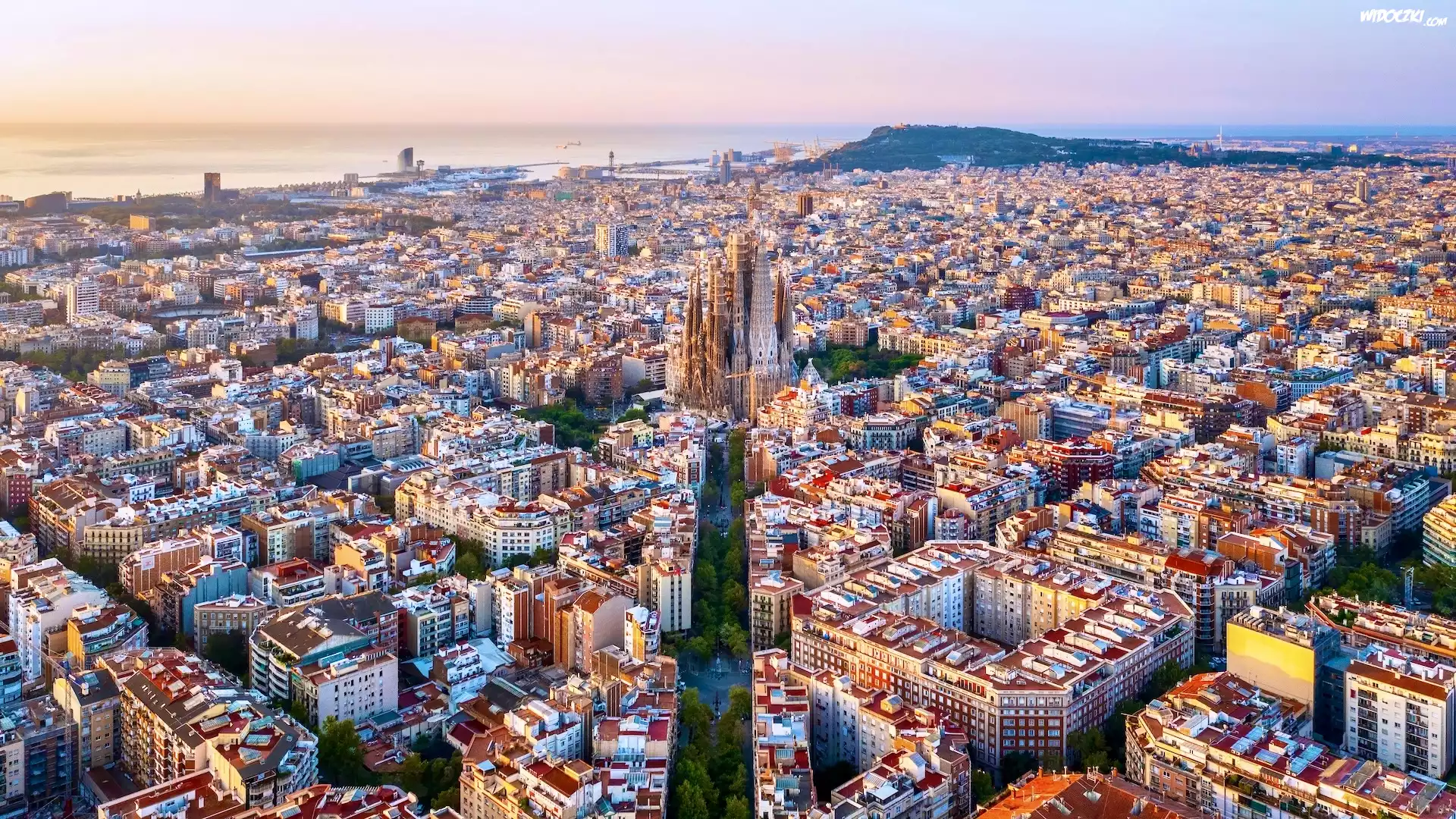 Zdjęcia, Hiszpania, Barcelona, Z lotu ptaka, Domy, Kościół, Sagrada Familia, Panorama, Zdjęcie miasta