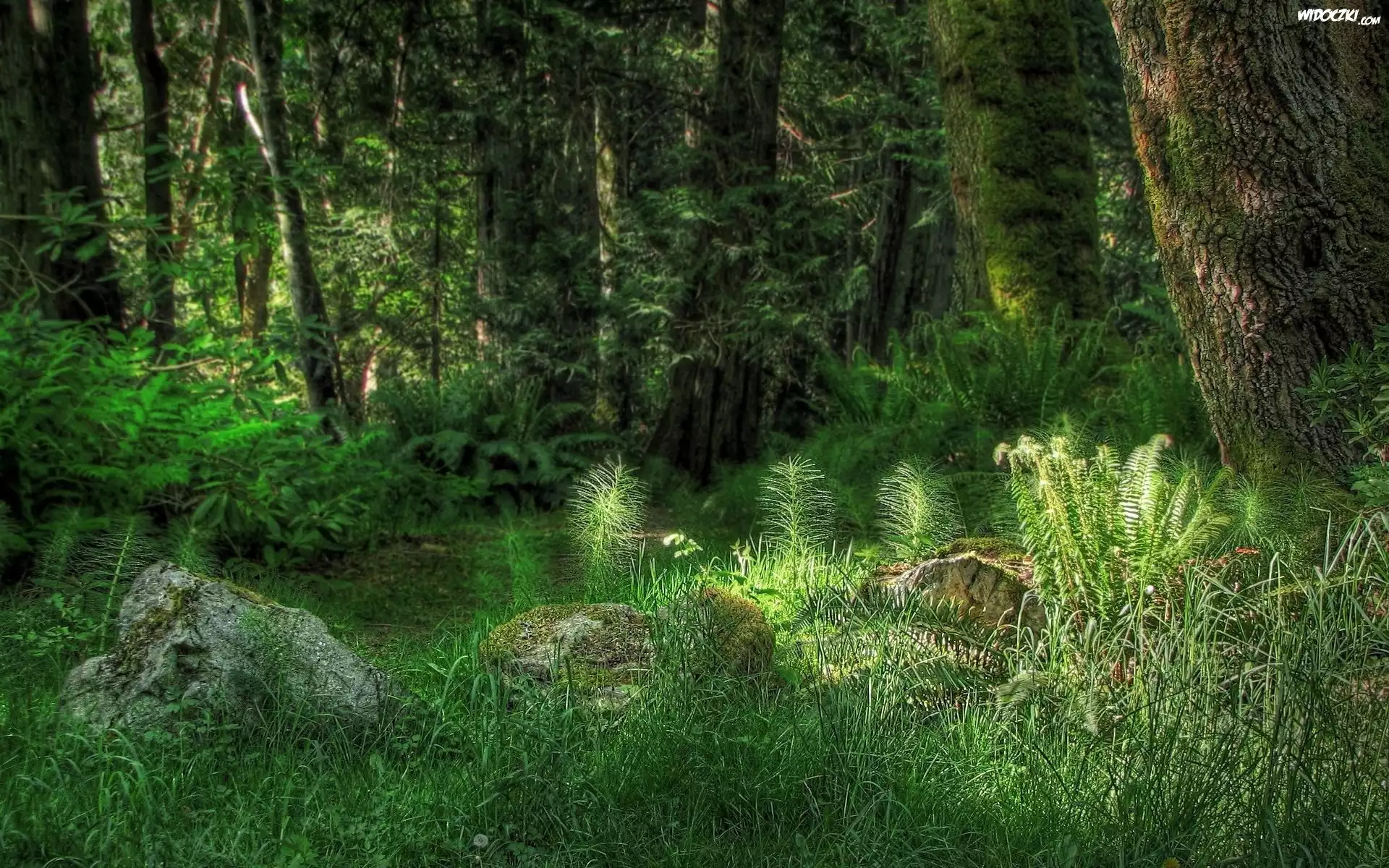 Paprocie, Drzewa, Las, Przebijające, Światło