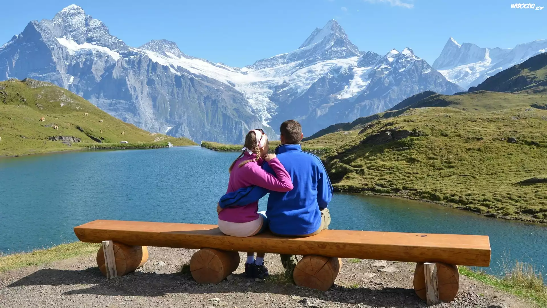 Zdjęcia, Para, Miłość, Góry, Jezioro, Ławka, Trawa