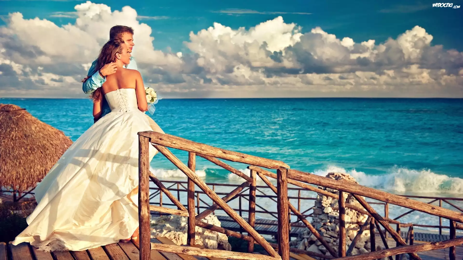 Zdjęcia, Para, Młodych, Molo, Morze, Niebo, Obłoki