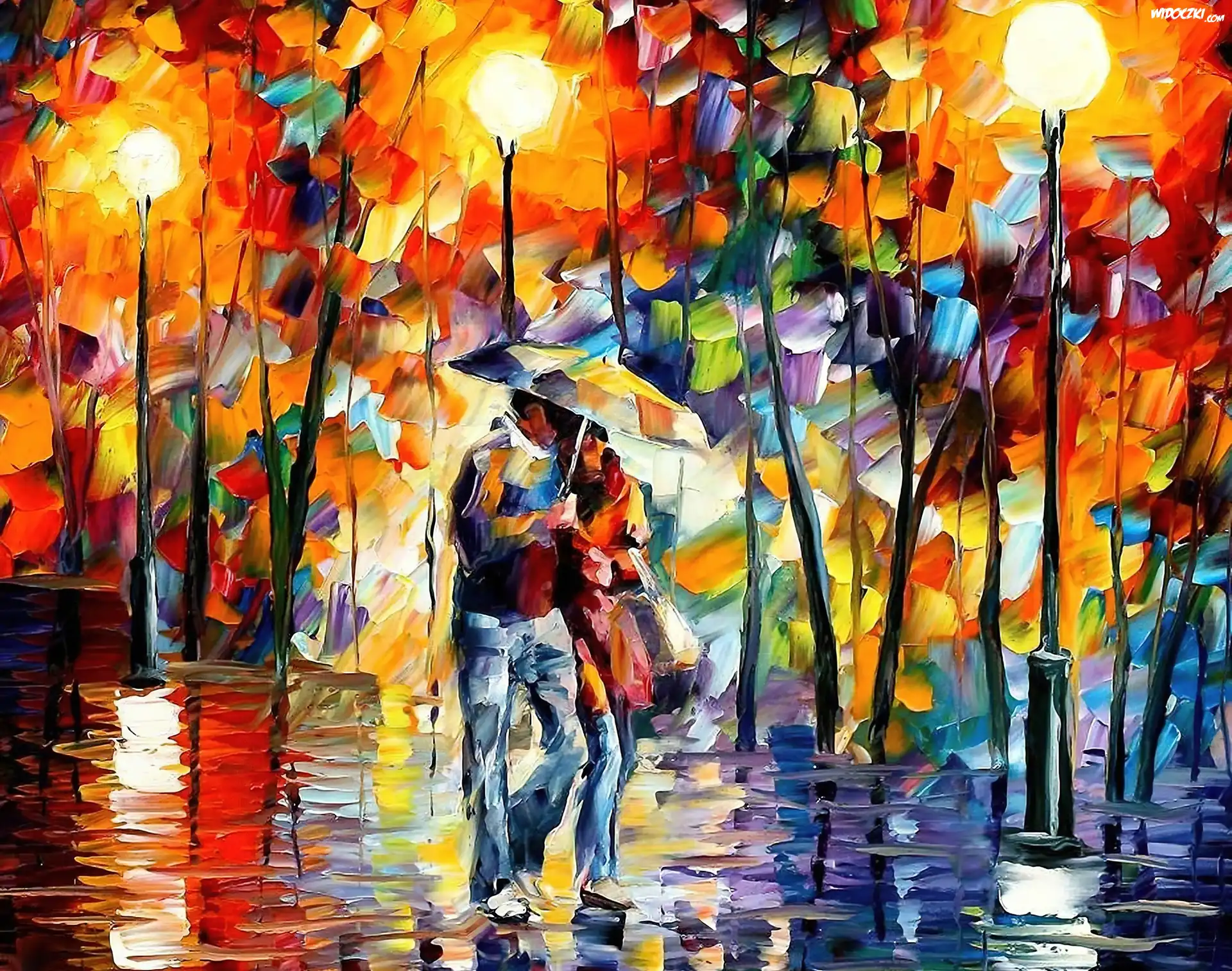 Park, Para, Zakochanych, Deszcz, Parasol, Reprodukcje Obrazów