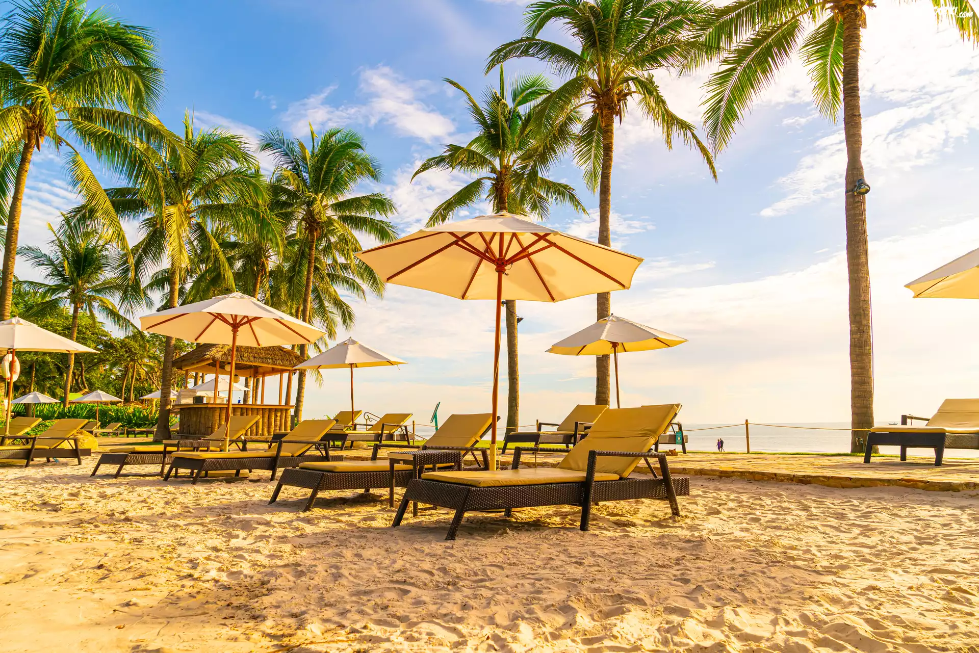 Lato, Wakacje, Leżaki, Parasole, Palmy, Plaża, Tropiki