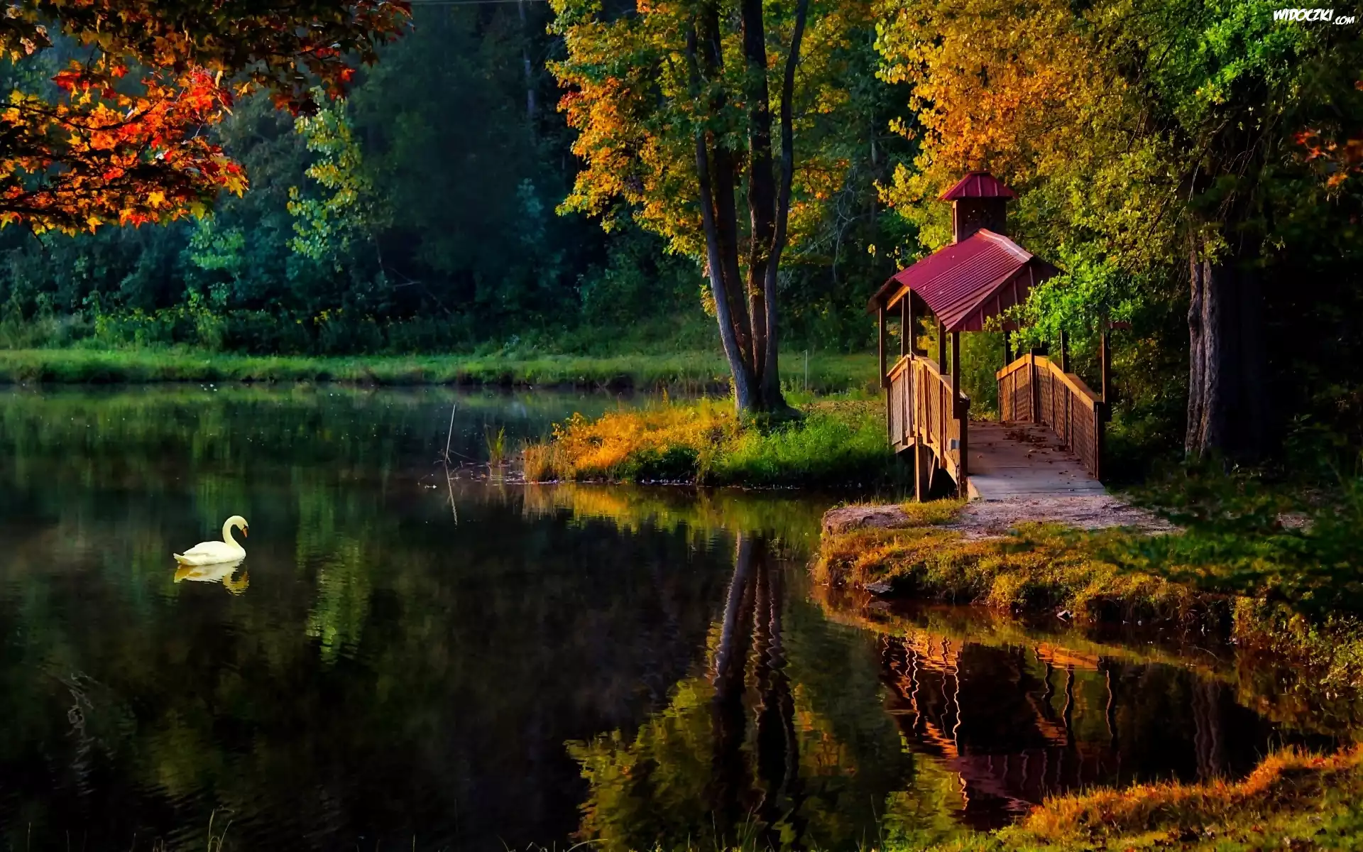 Zdjęcia, Park, Staw, Łabędź, Jesień