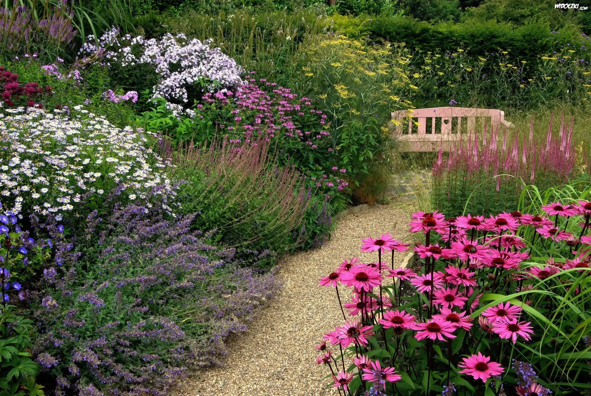Zdjęcia, Park, Kwiaty, Ławeczka, Ścieżka