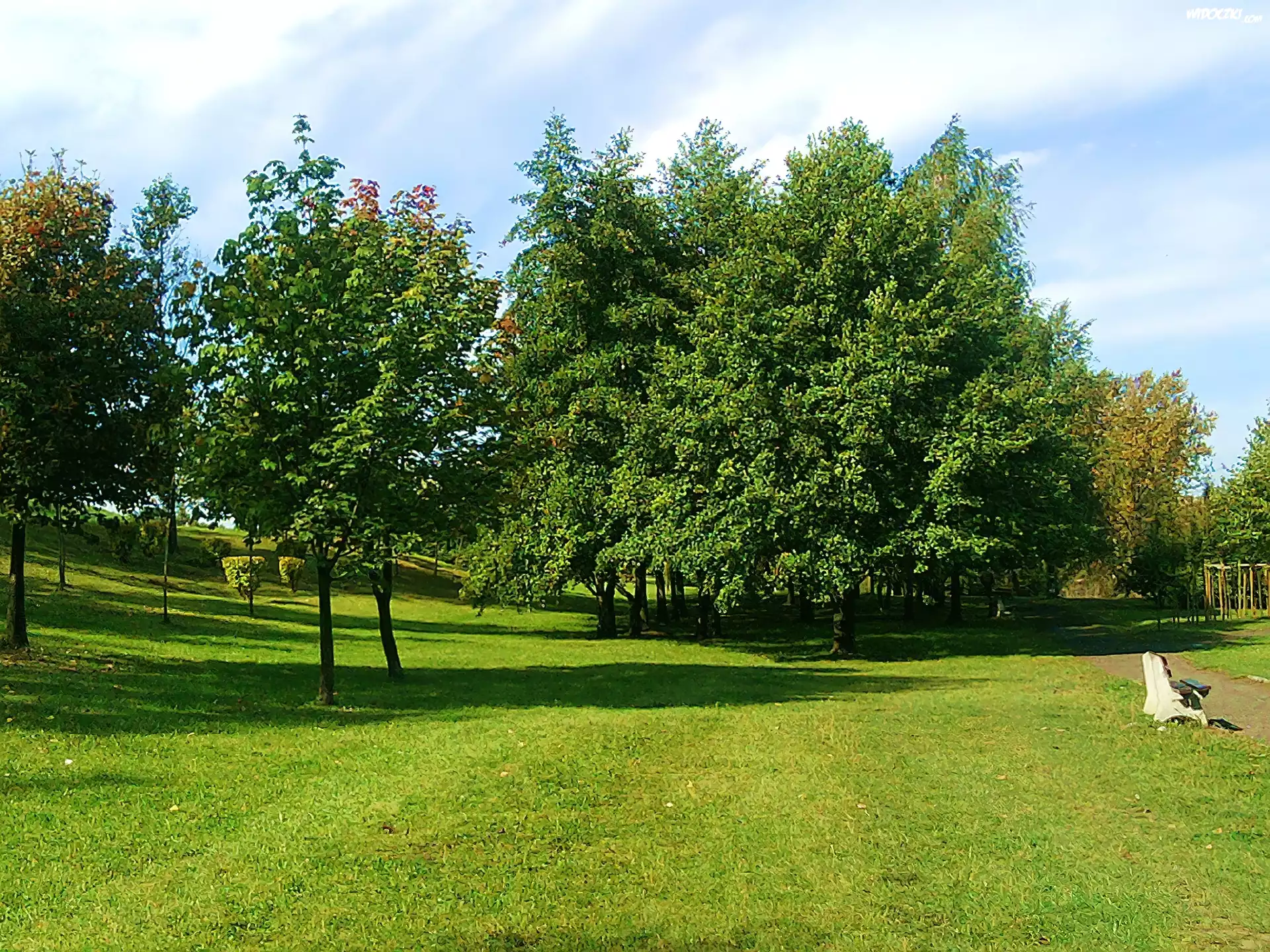 Zdjęcia, Park, Drzewa, Trawa, Ławka, Sosnowiec