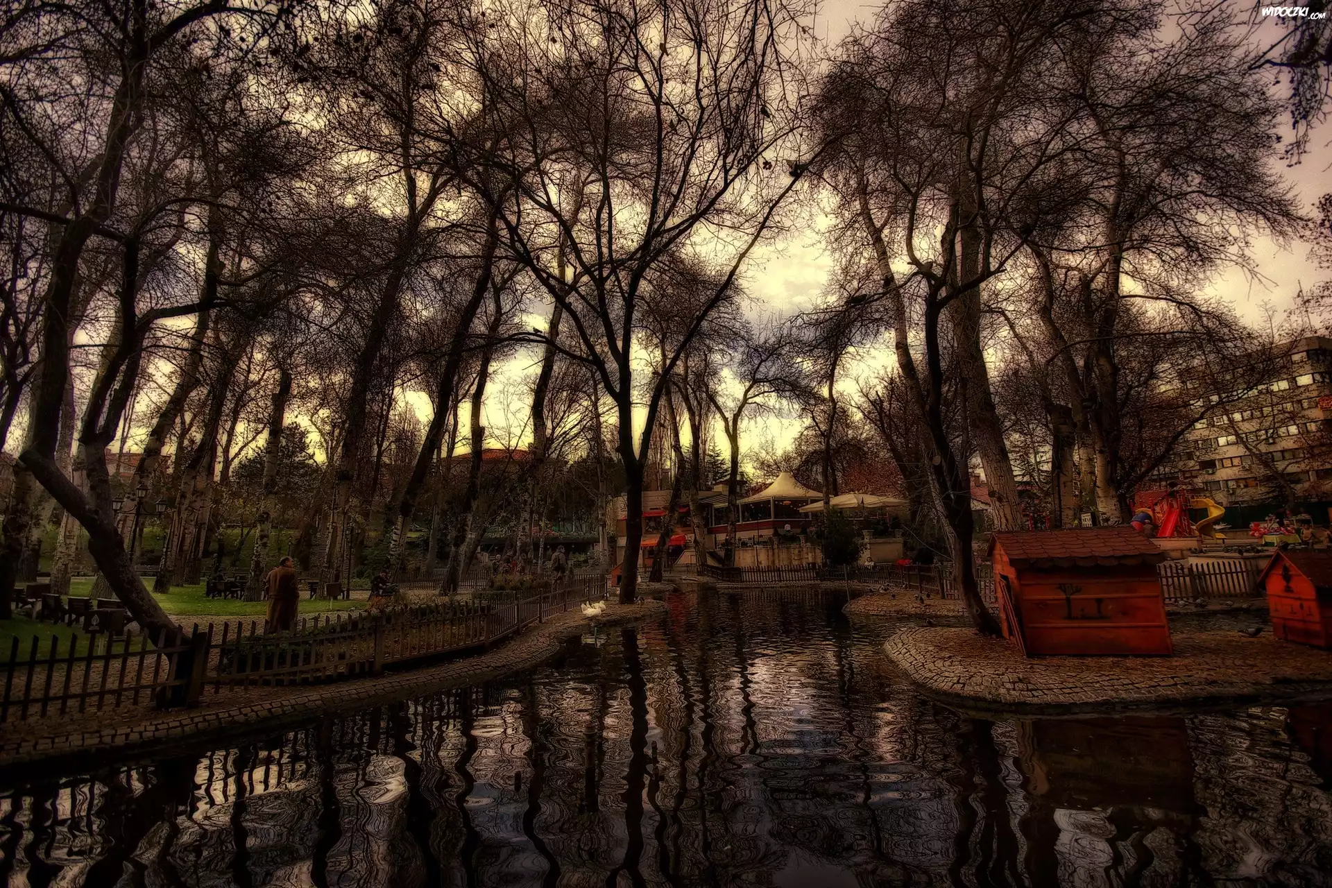 Zdjęcia, Park, Drzewa, Ławki, Woda