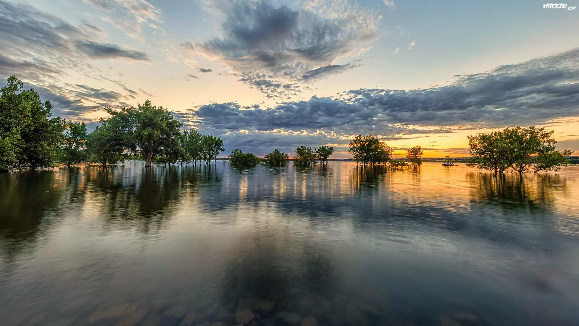 Stany Zjednoczone, Kolorado, Park stanowy, Chatfield State Park, Jezioro, Chatfield Lake, Łódka, Drzewa |