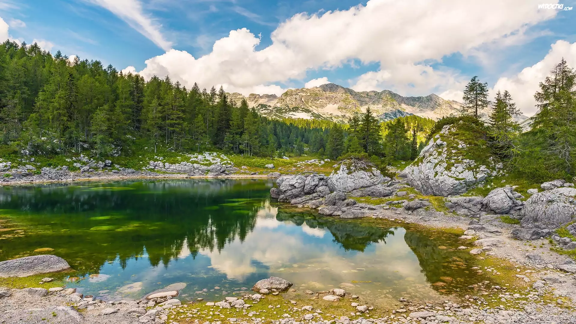 Zdjęcia, Triglavski Park Narodowy, Słowenia, Góry, Jezioro, Drzewa, Chmury
