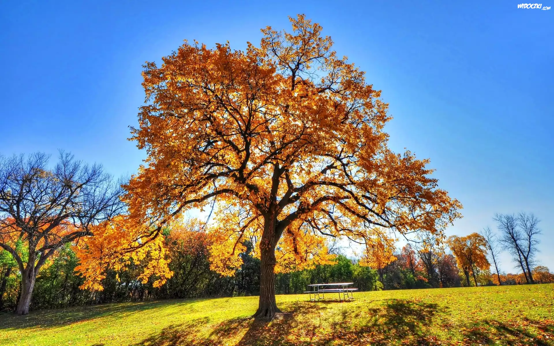 Zdjęcia, Park, Jesień, Drzewa, Dąb, Ławka