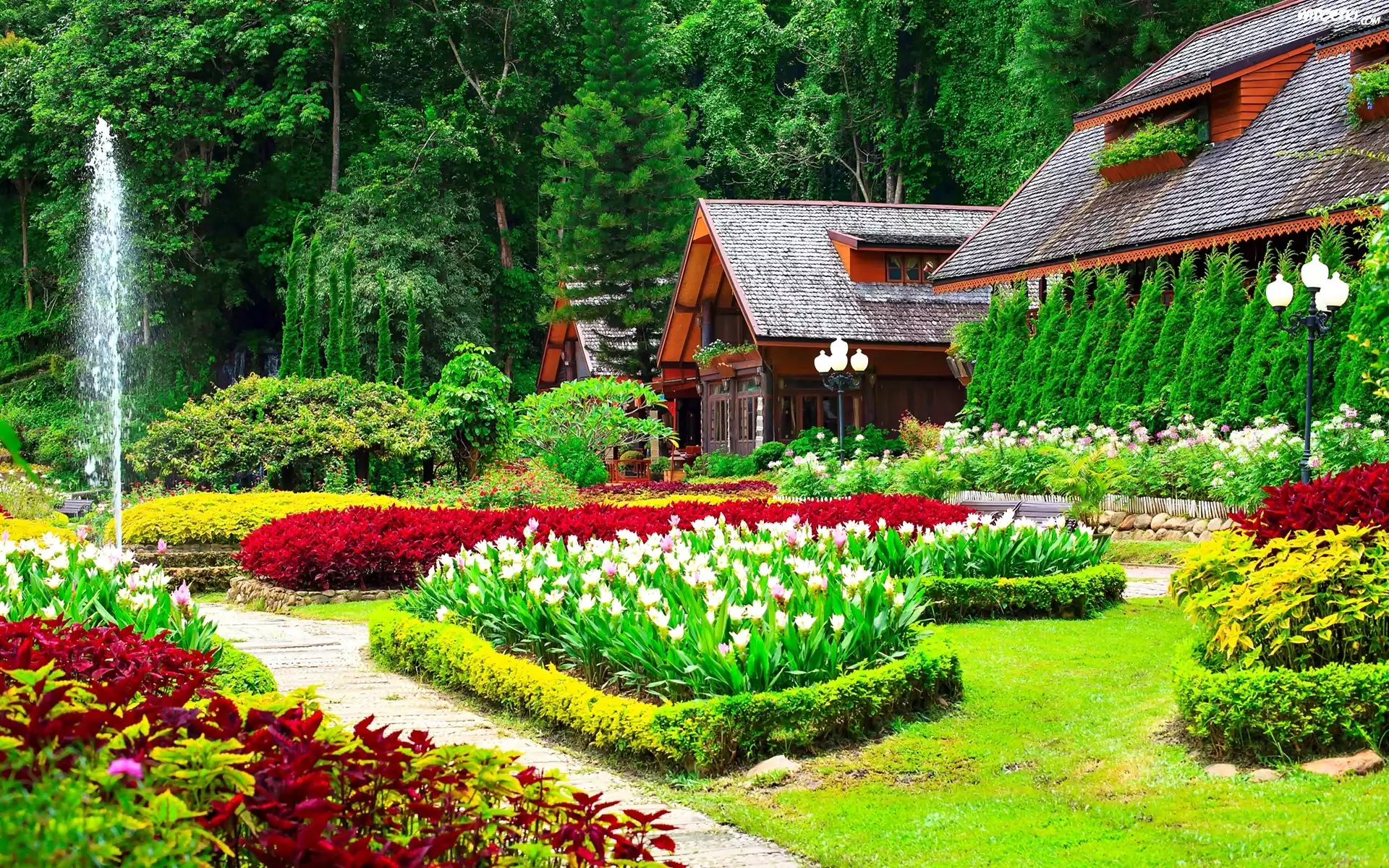 Zdjęcia, Park, Lato, Domy, Fontanna