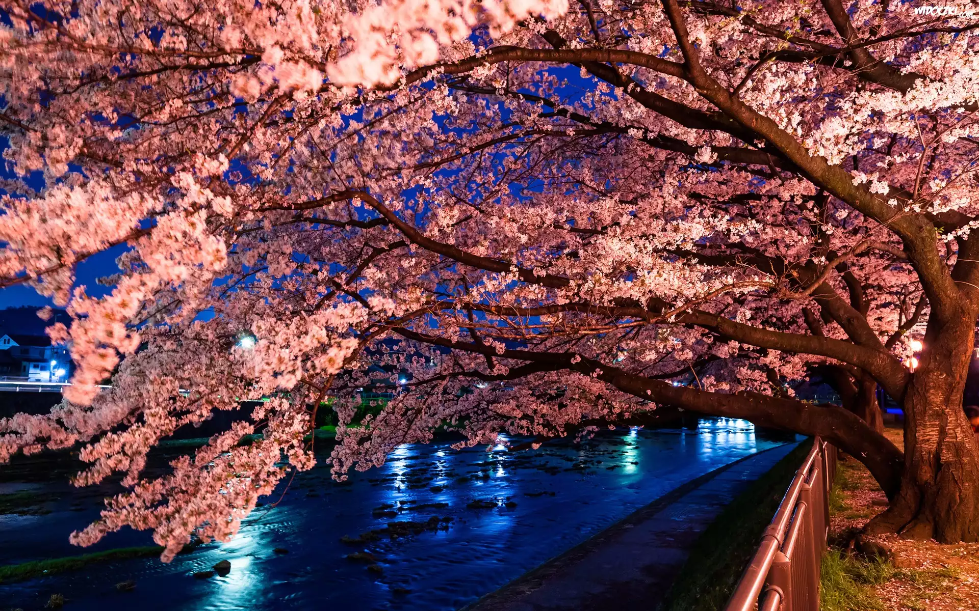Zdjęcia, Park, Kwitnące, Drzewa, Droga, Rzeka