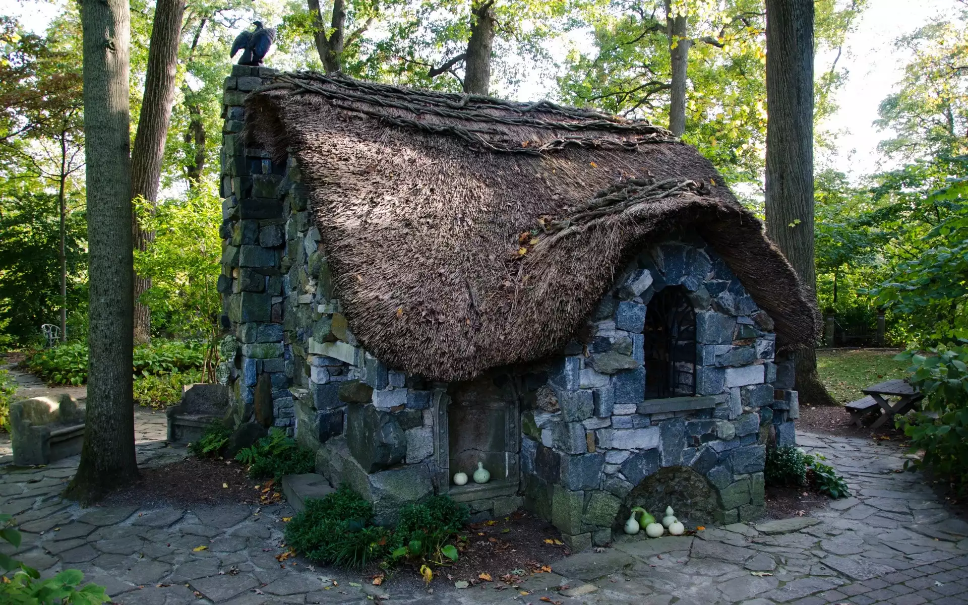 Zdjęcia, Park, Domek, Drzewa, Ławki