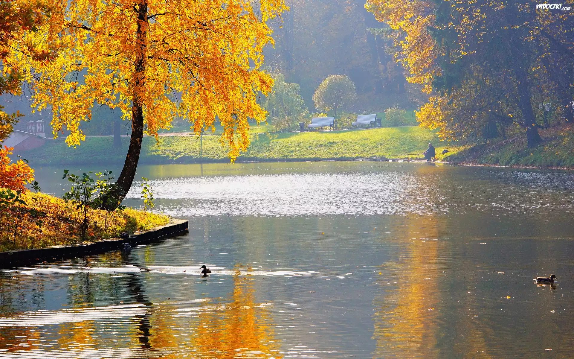 Zdjęcia, Park, Woda, Kaczki, Drzewa, Jesień