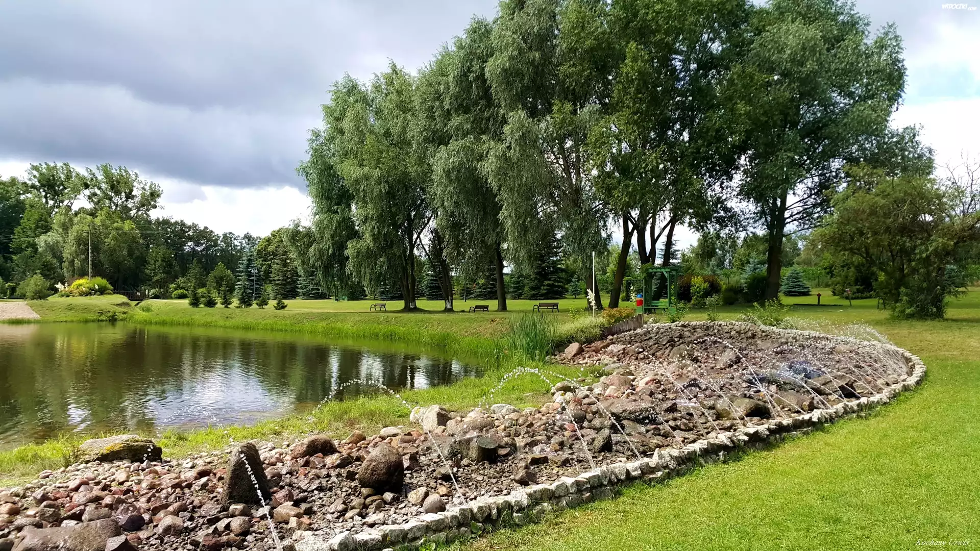 Zdjęcia, Park, Jeziorko, Kamienie, Drzewa, Ławki