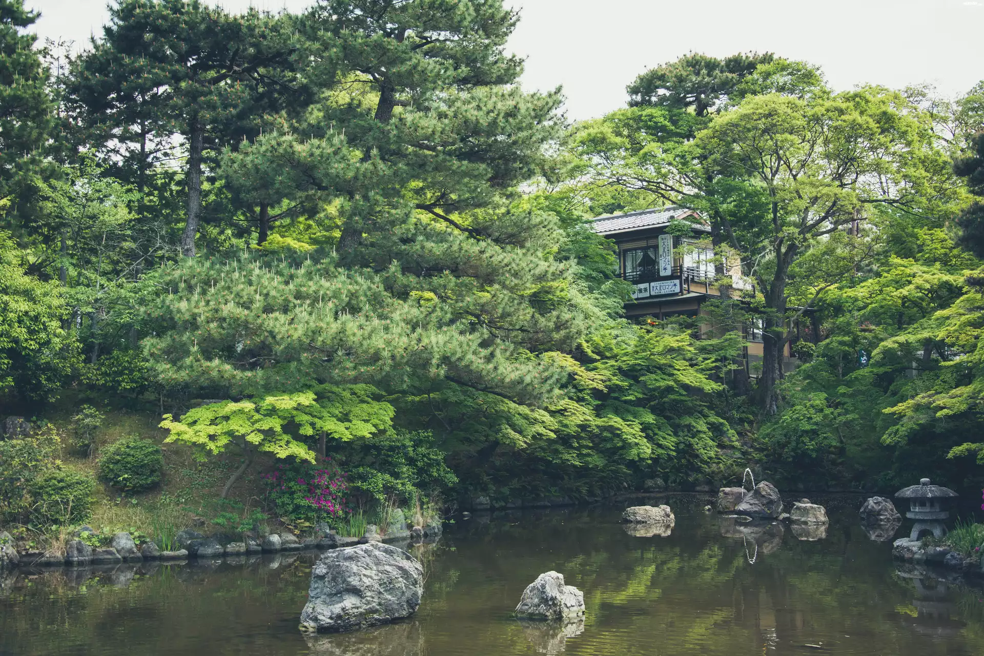 Park, Jeziorko, Kamienie, Drzewa, Domek