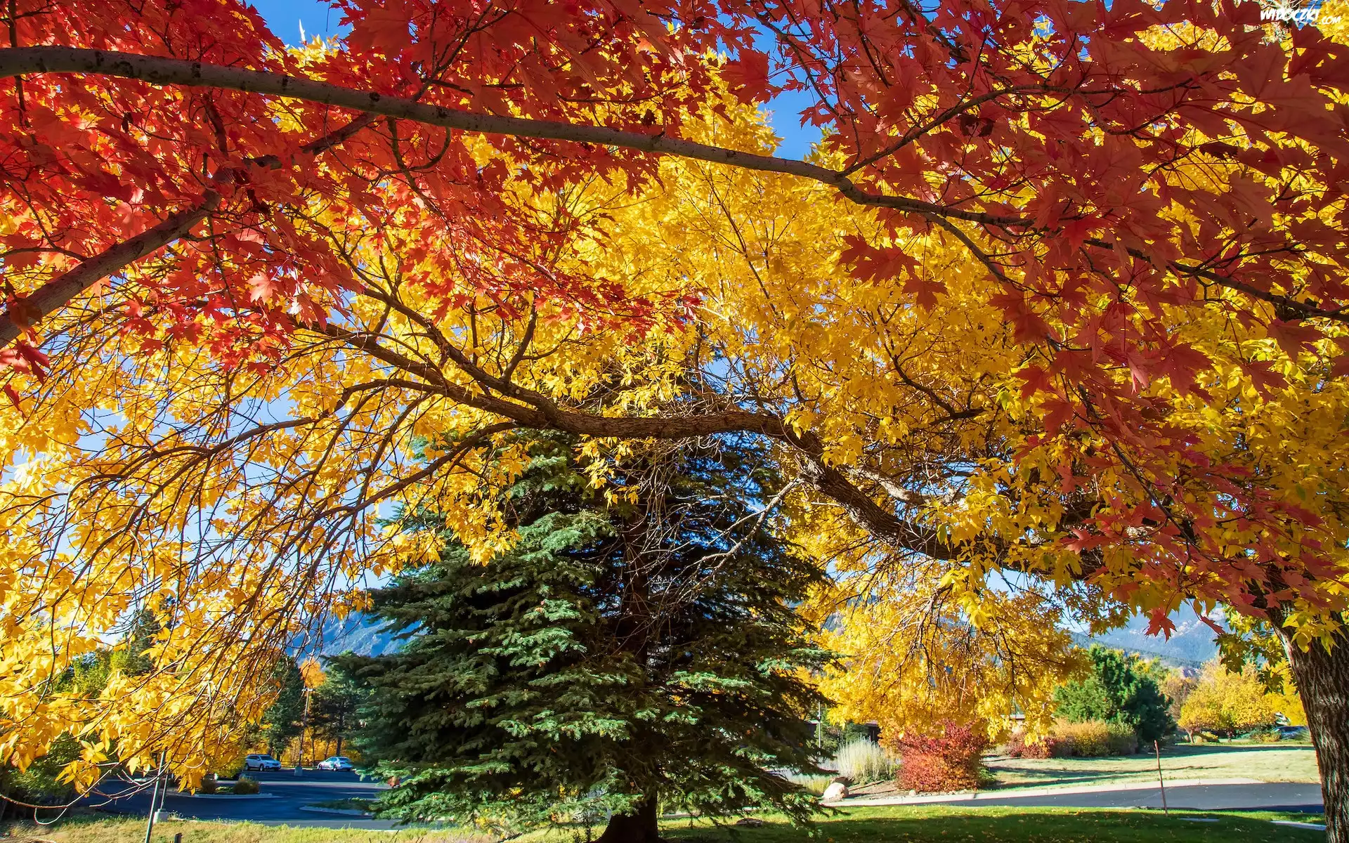 Jesień, Park, Drzewa, Liście, Kolorowe