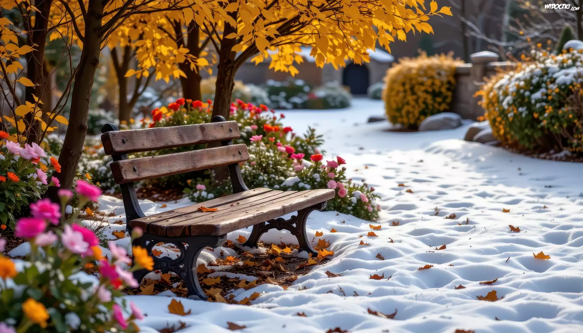 Ławka, Kwiaty, Drzewa, Krzewy, Pożółkłe, Liście, Śnieg, Park