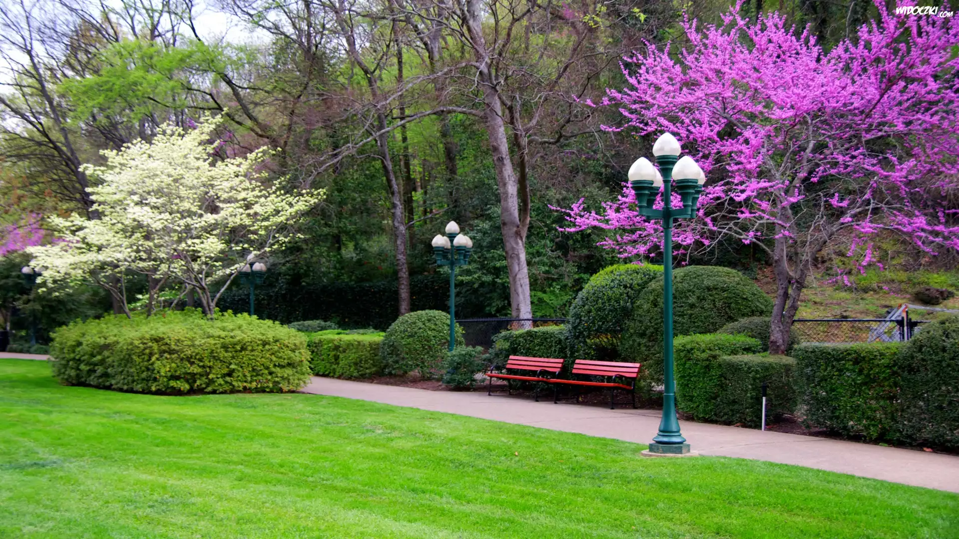 Zdjęcia, Park, Kwitnące, Drzewa, Latarnia
