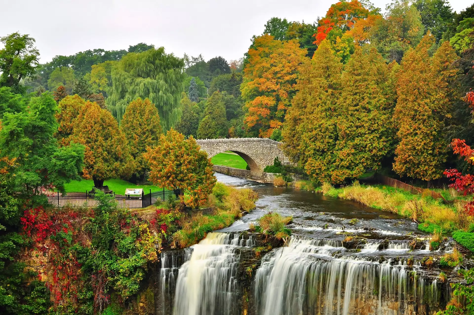 Park, Rzeka, Most, Wodospad, Drzewa, Jesień