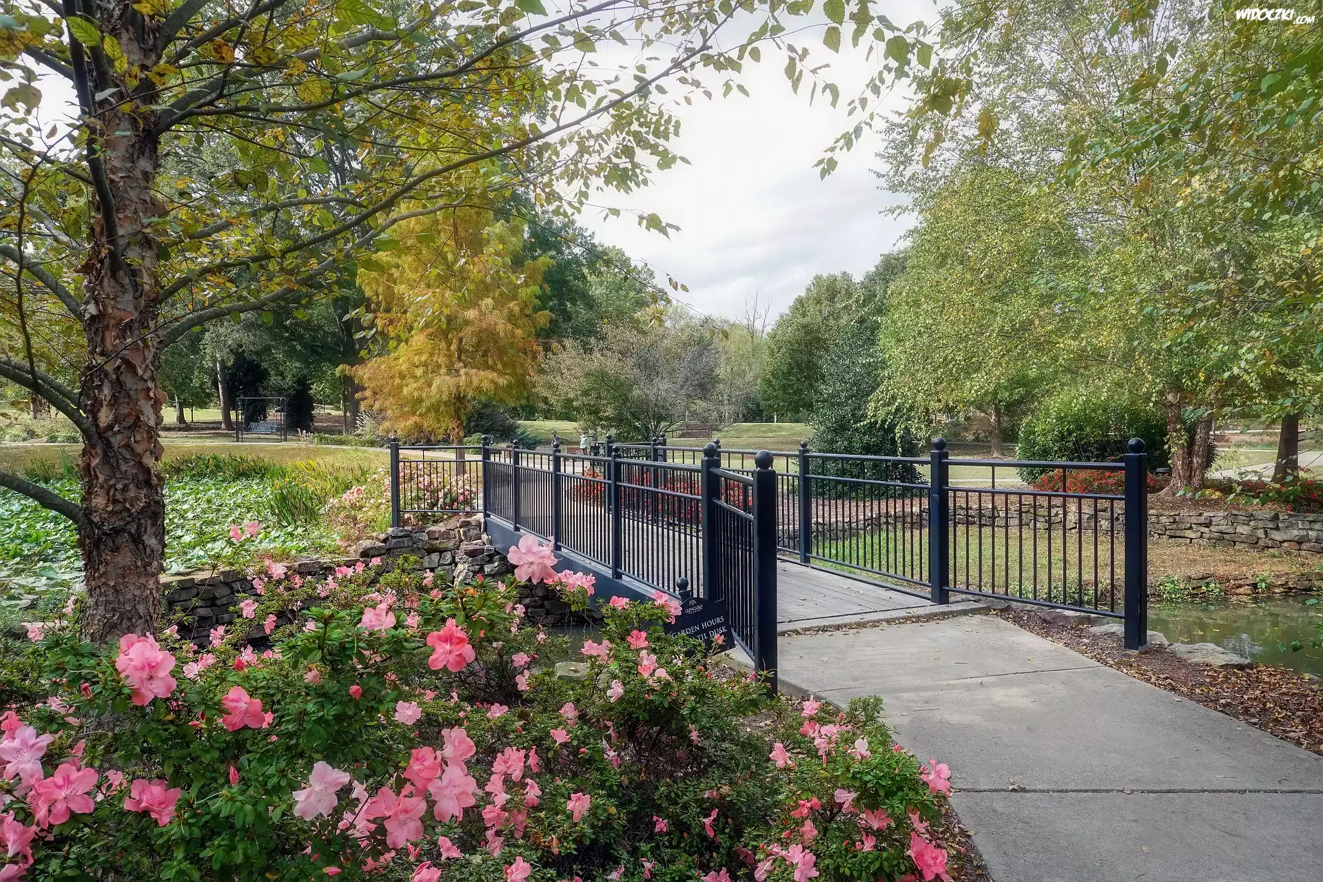 Zdjęcia, Park, Mostek, Drzewa, Azalie