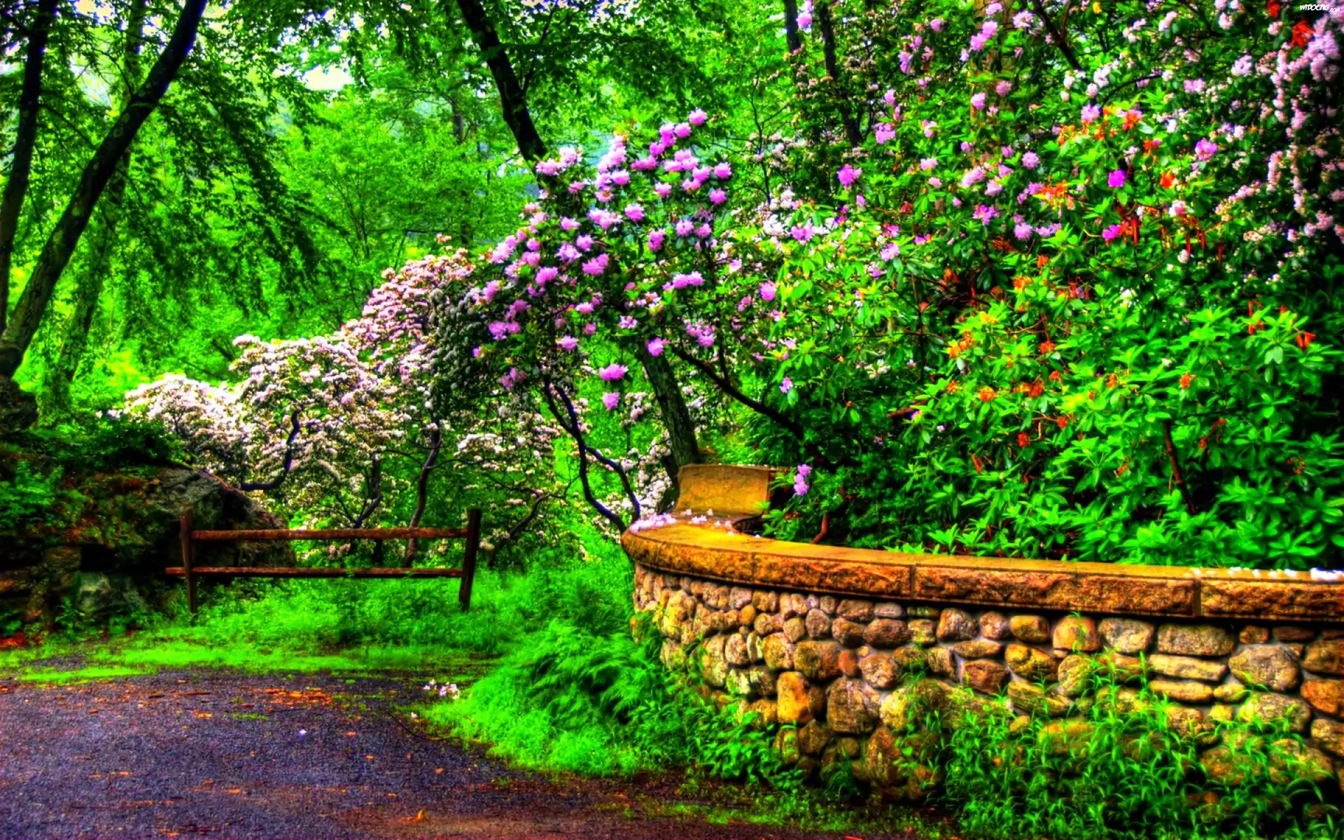 Zdjęcia, Park, Alejka, Murek, Drzewa, Krzewy