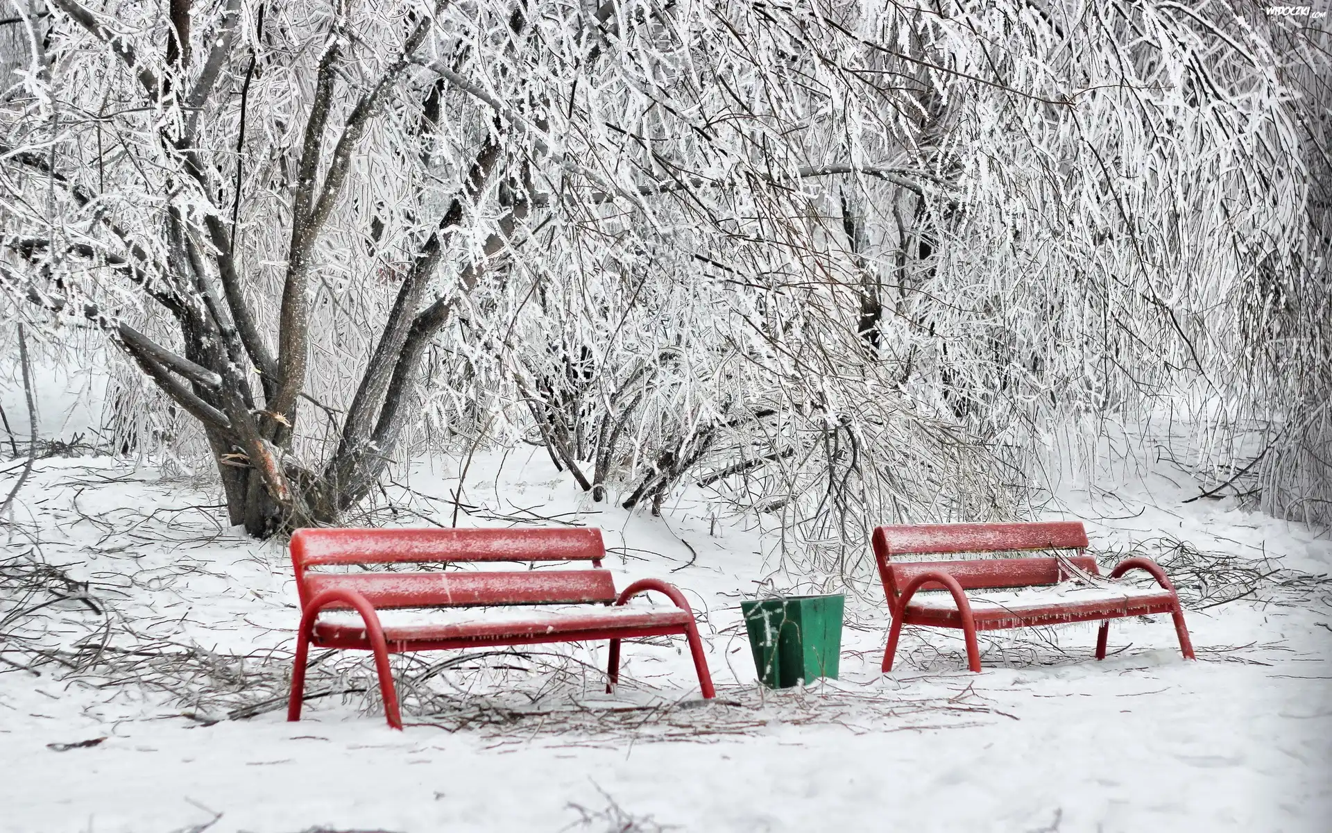 Zdjęcia, Park, Oszronione, Drzewa, Ławki