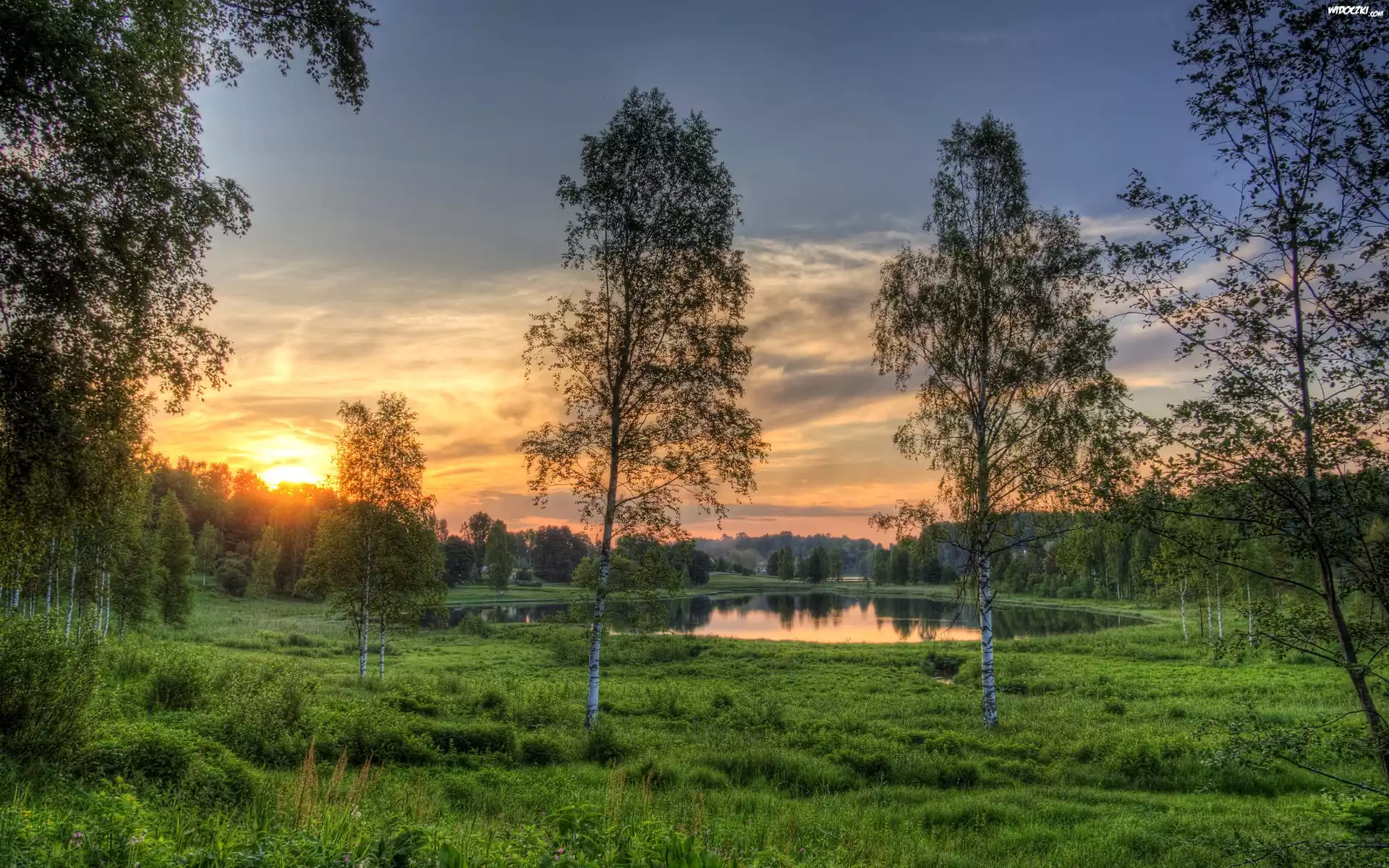 Park, Zachód, Słońca, Staw, Drzewa, Brzozy
