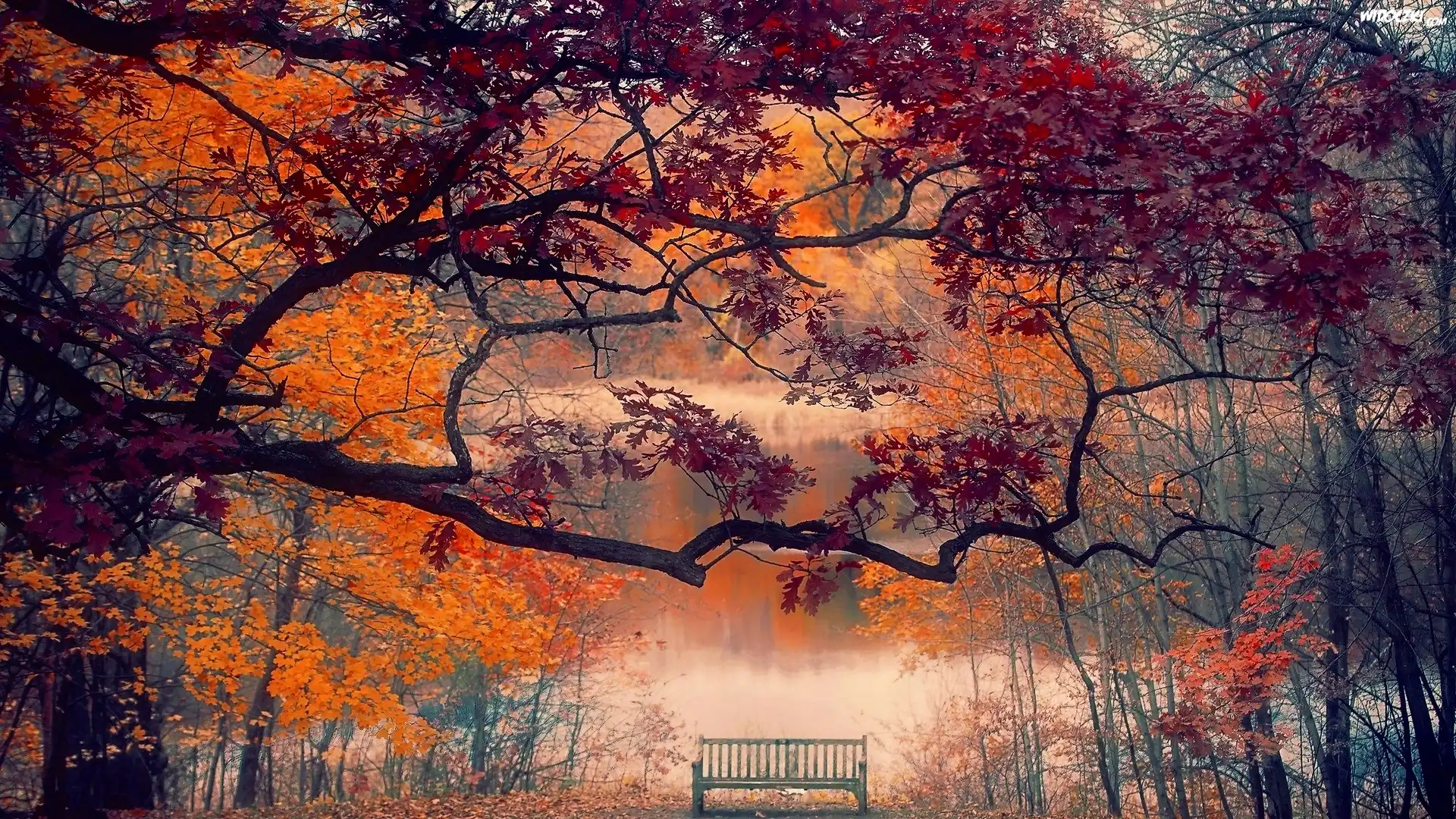 Zdjęcia, Park, Mgła, Staw, Drzewa, Ławka