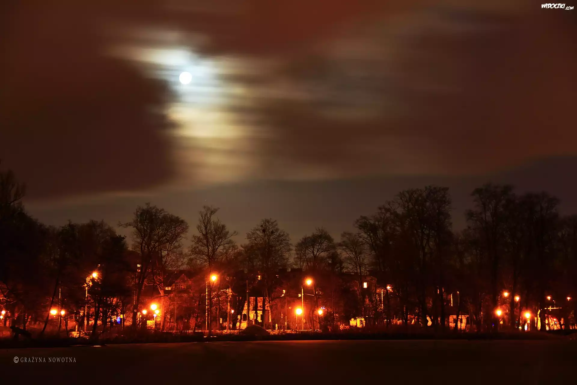 Zdjęcia, Park, Wieczór, Drzewa, Księżyc