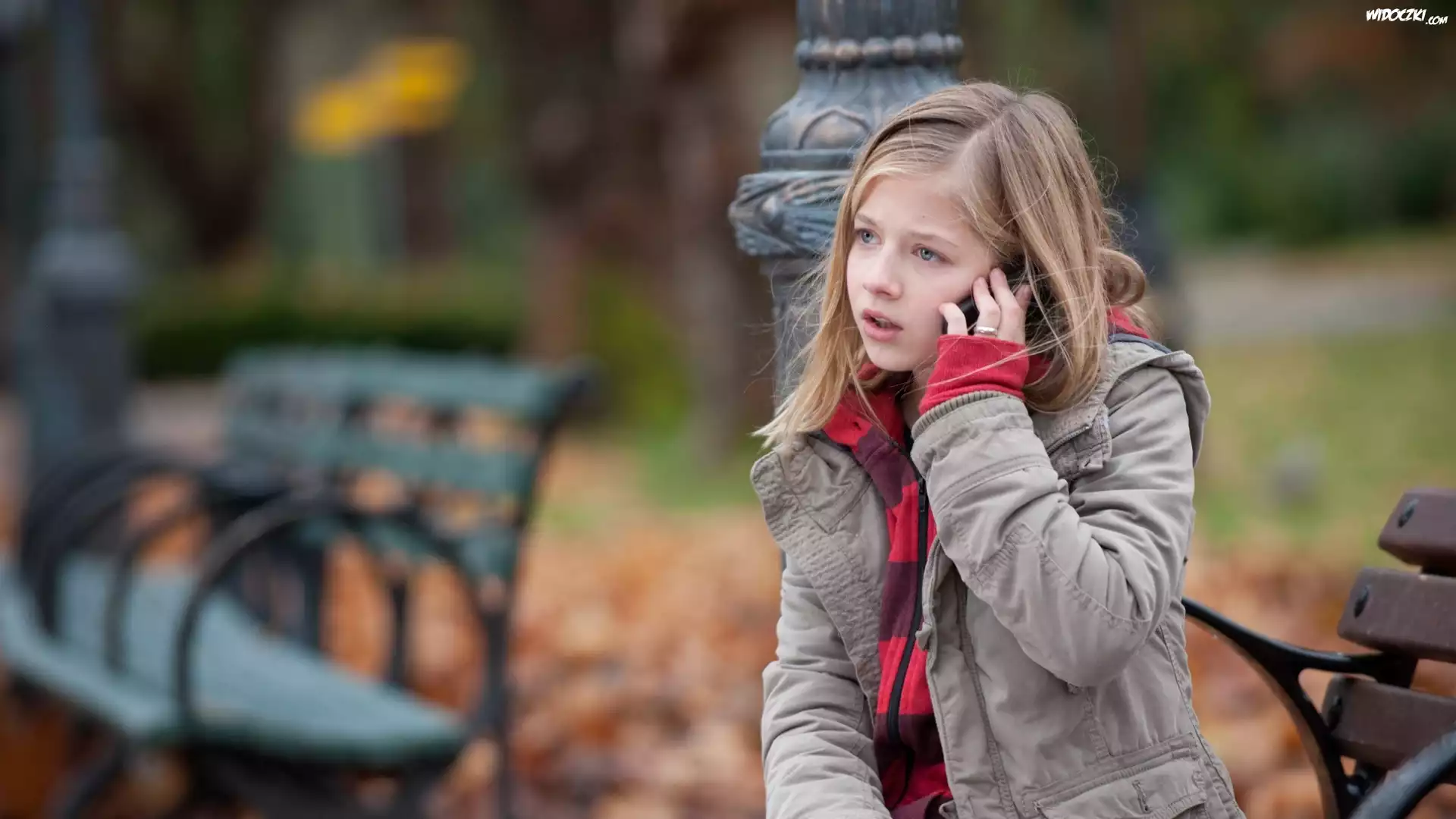 Zdjęcia, Park, Ławki, Dziecko, Dziewczynka, Telefon