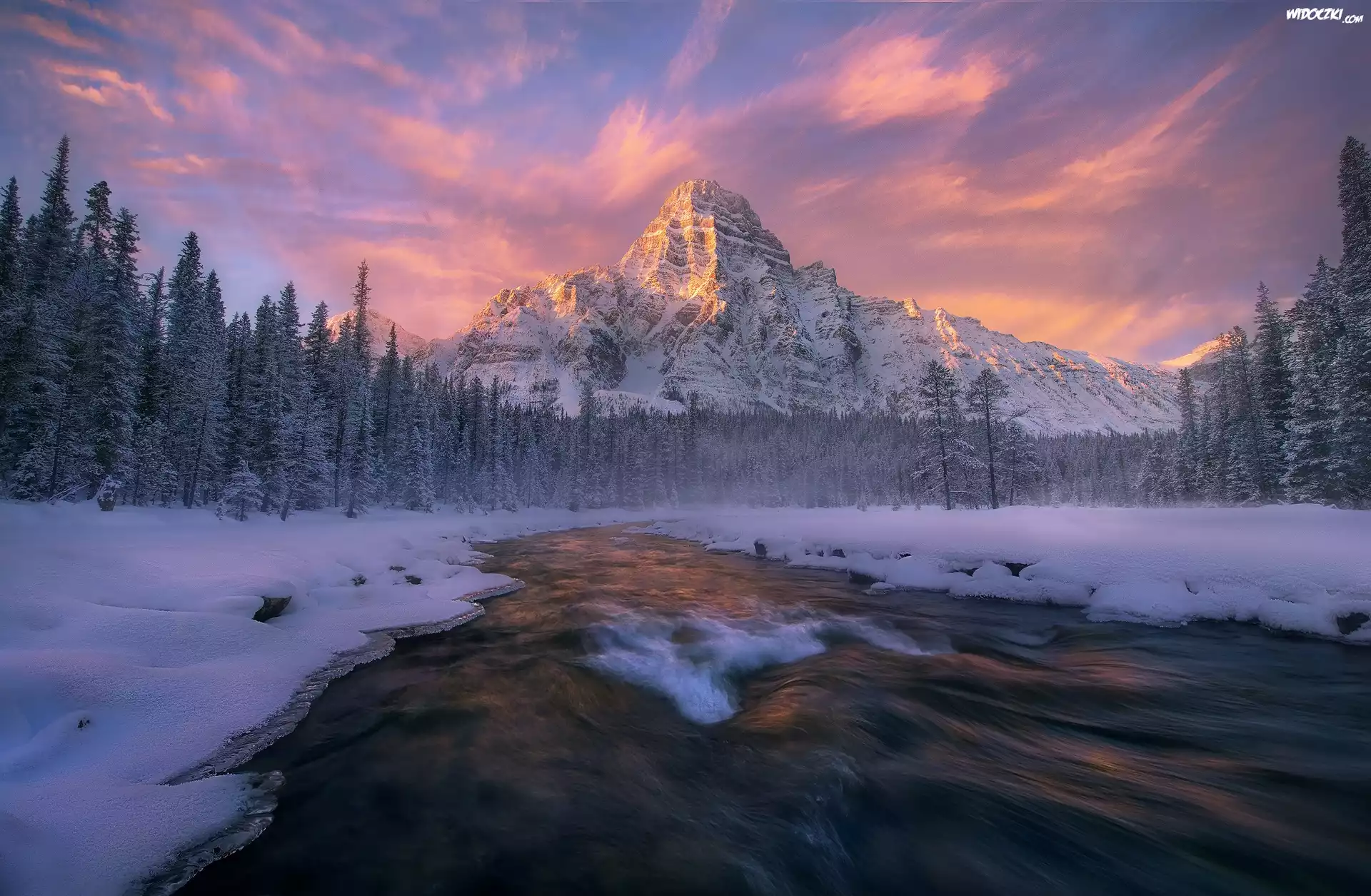 Kanada, Park Narodowy Banff, Zima, Rzeka, Drzewa, Góry