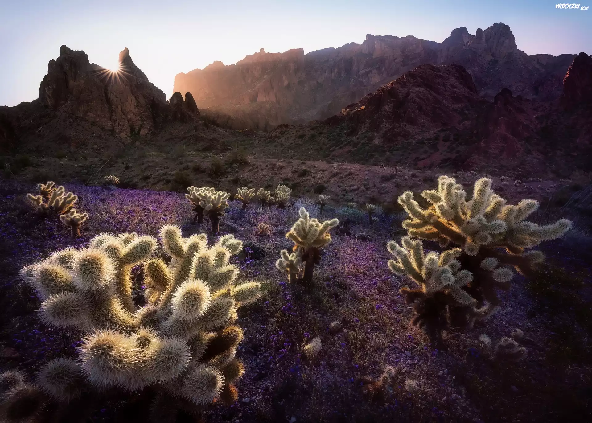 Zdjęcia, Góry, Promienie słońca, Kaktusy cholla, Park Narodowy Saguaro, Stan Arizona, Stany Zjednoczone
