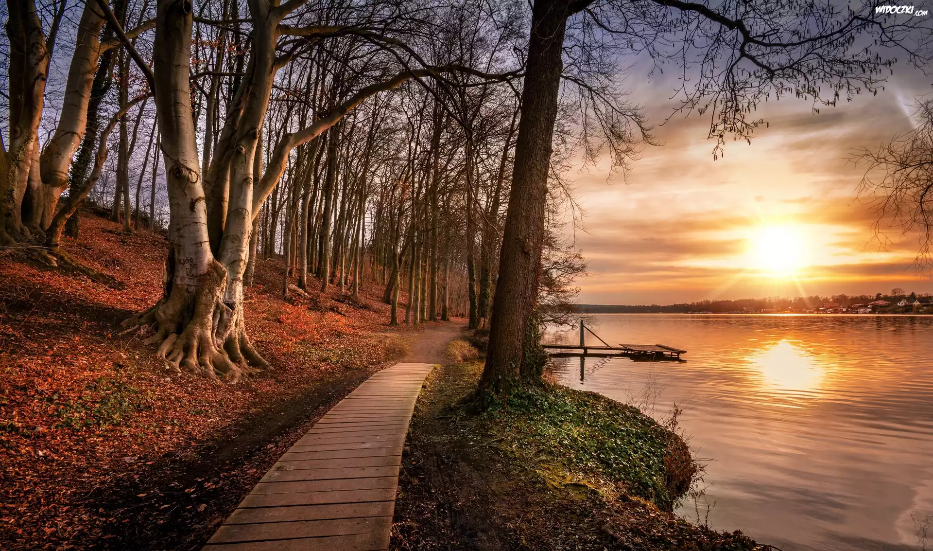 Zdjęcia, Holandia, Prowincja Utrecht, Wieś Leersum, Park, Jezioro, Pomost, Ścieżka, Jesień, Wschód słońca