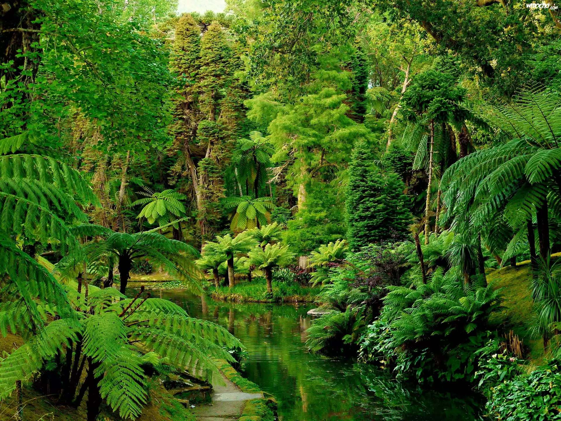 Park, Jeziorko, Roślinność, Palmy, Iglaki, Krzewy