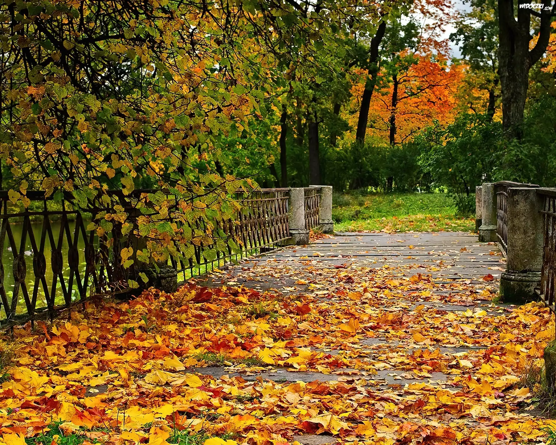 Zdjęcia, Park, Liście, Jesień, Mostek