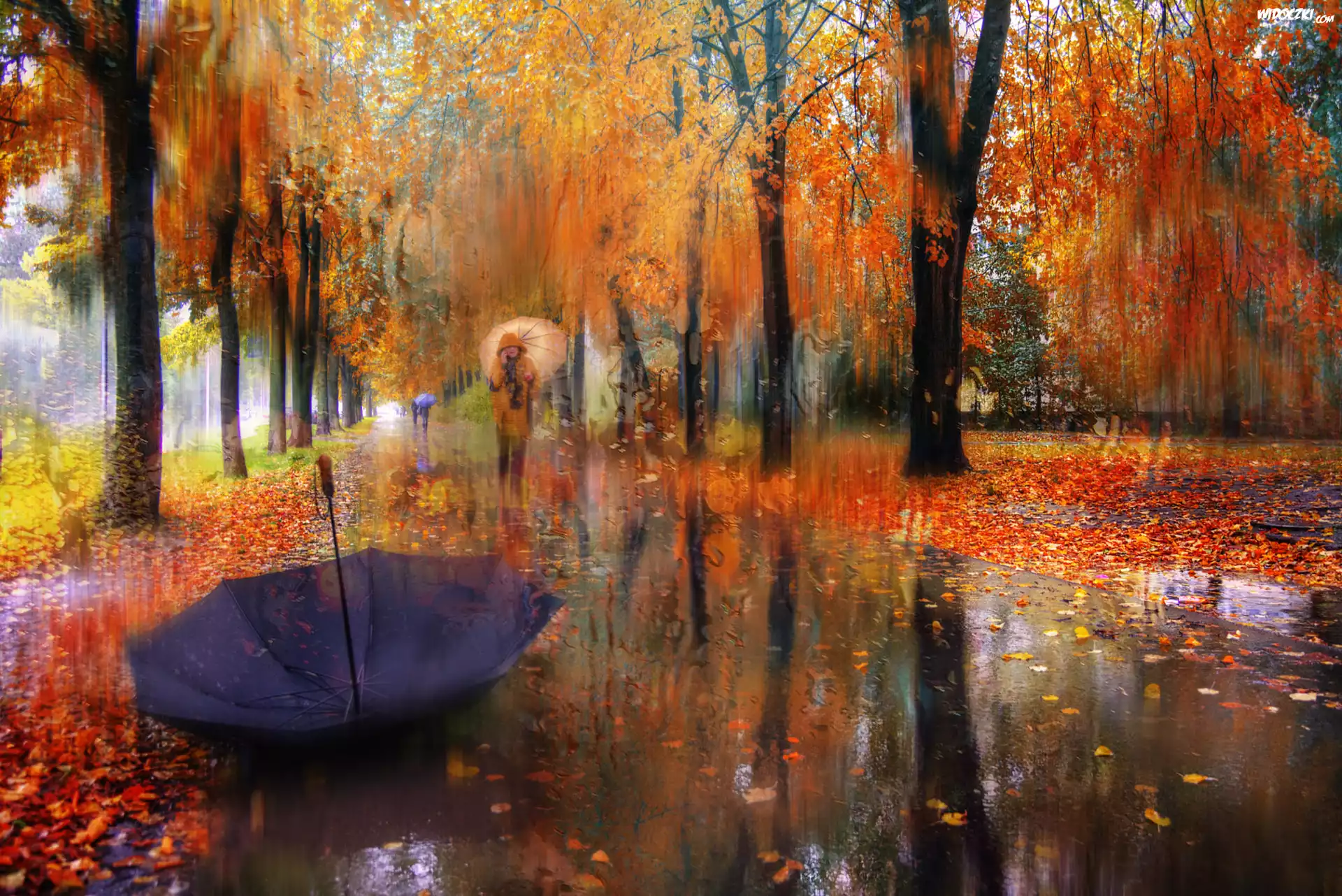 Jesień, Park, Aleja, Deszcz, Drzewa, Ludzie, Parasol