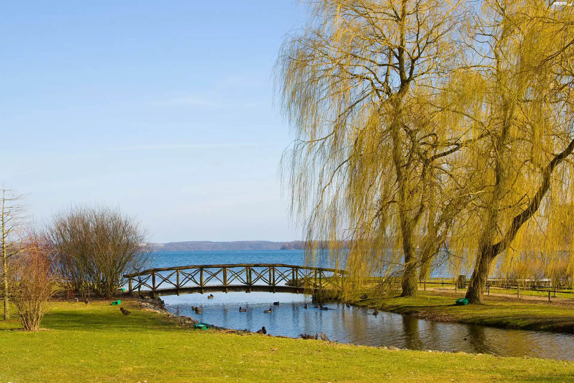 Zdjęcia, Park, Mostek, Jezioro, Wierzba