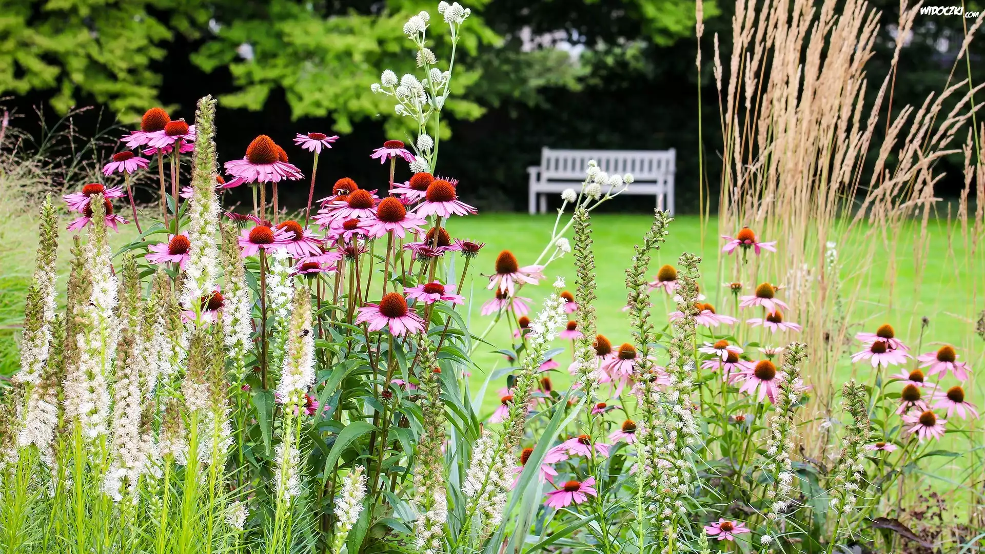 Zdjęcia, Park, Ławka, Jeżówka, Kwiaty