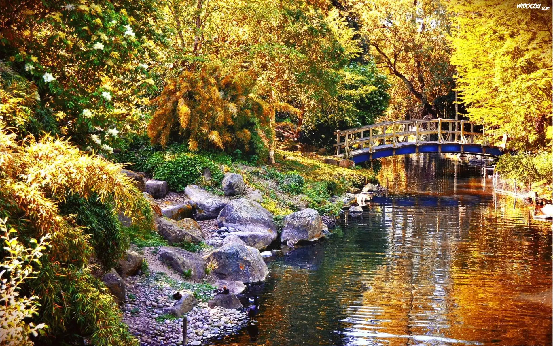 Park, Rzeczka, Mostek, Kamienie, Jesień