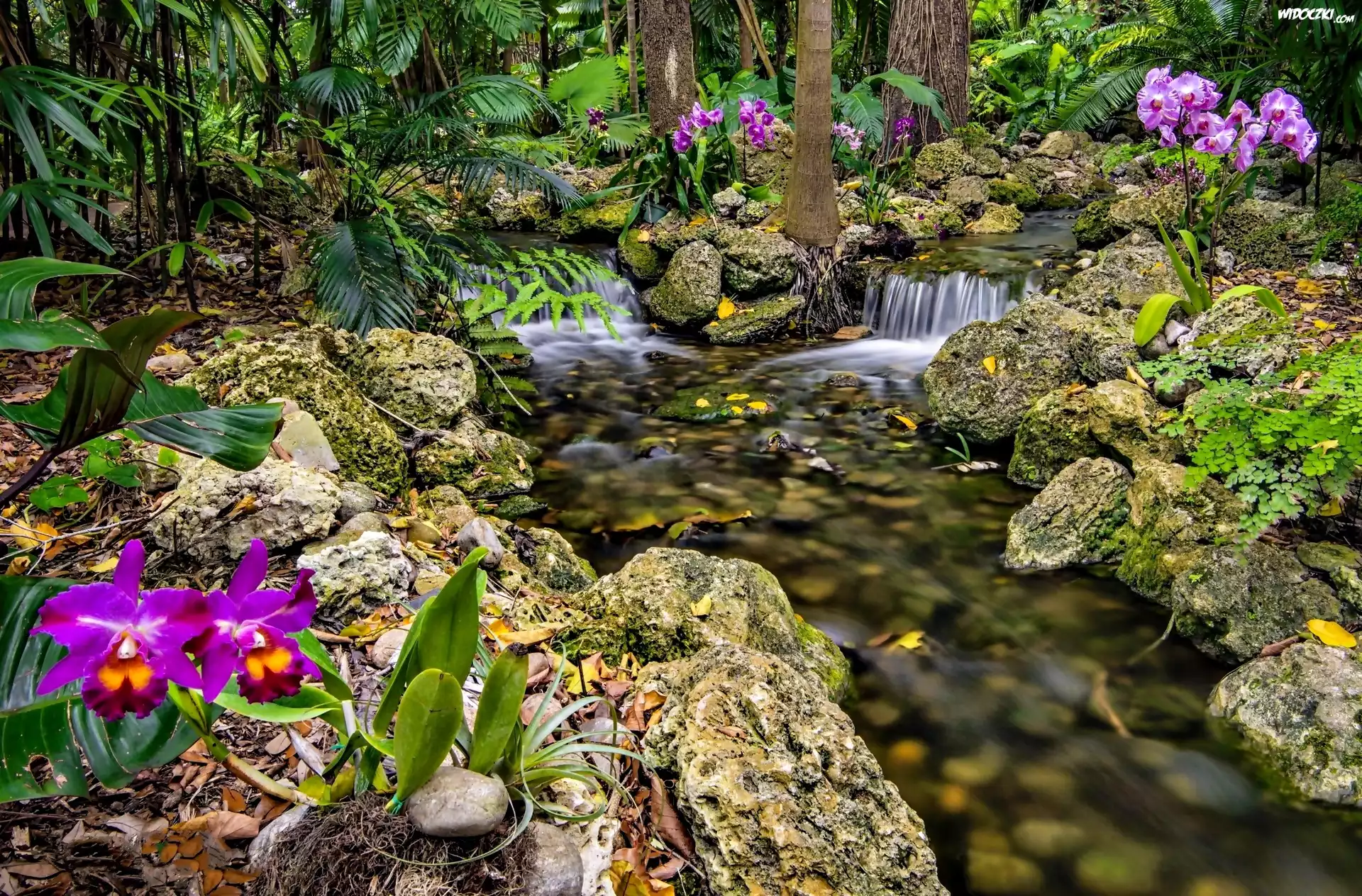 Zdjęcia, Park, Strumyk, Kamienie, Kwiaty