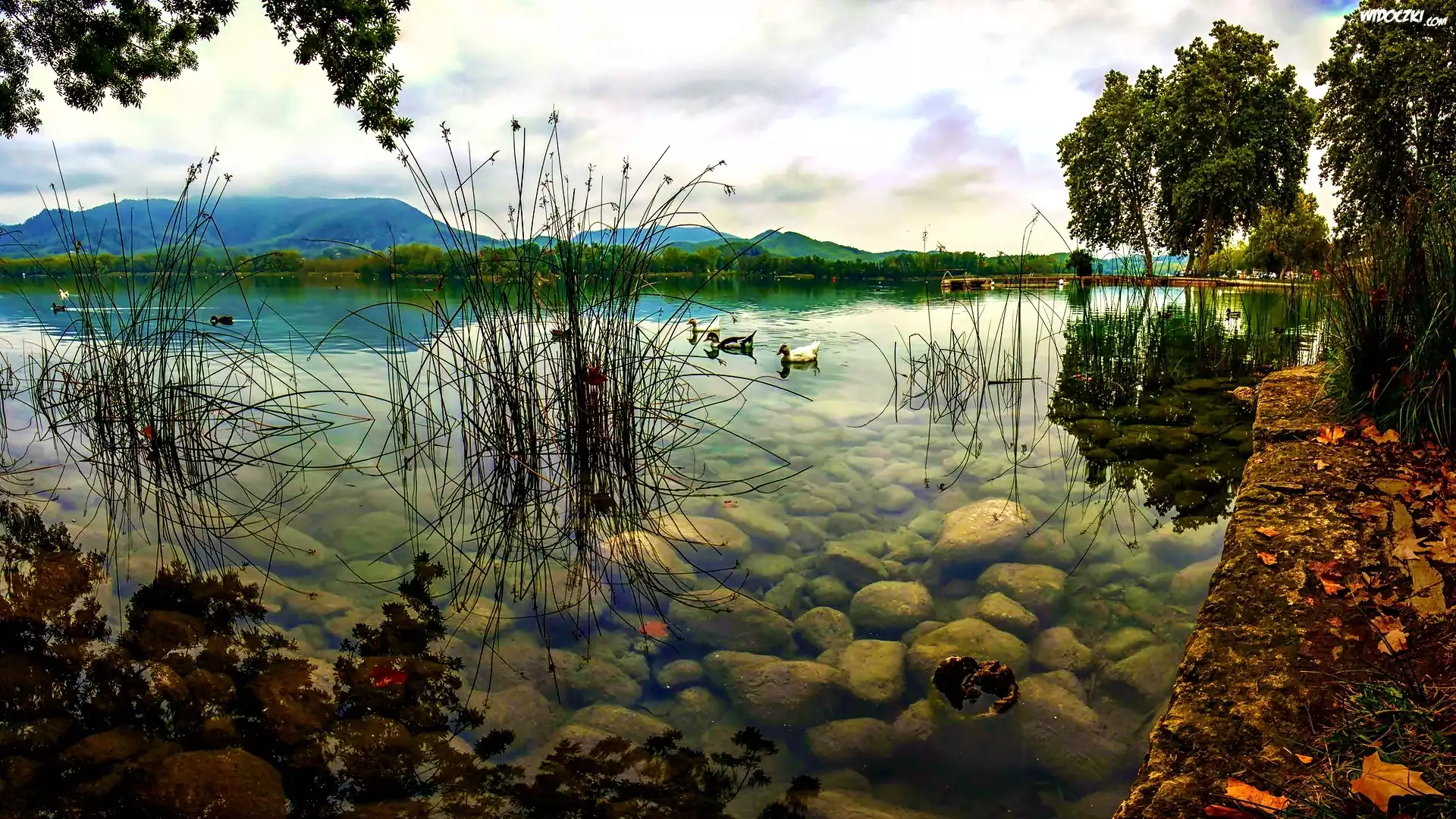 Zdjęcia, Park, Staw, Trawa, Kamienie, Łabędzie