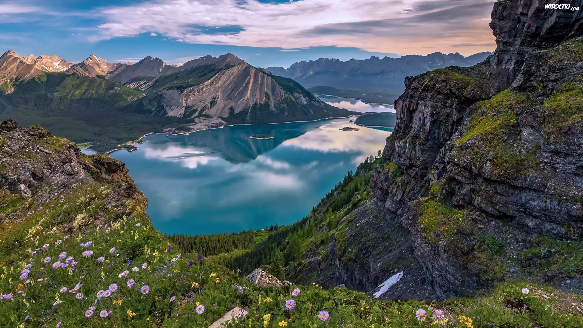 Zdjęcia, Kanada, Jezioro Upper Kananaskis Lake, Park Prowincjonalny Petera Lougheeda, Kwiaty, Góry, Chmury