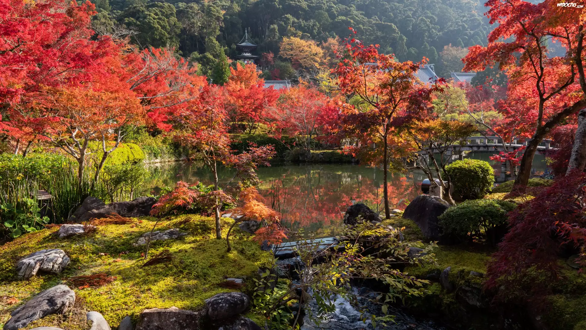 Park, Kolorowe, Drzewa, Staw, Kioto, Japonia