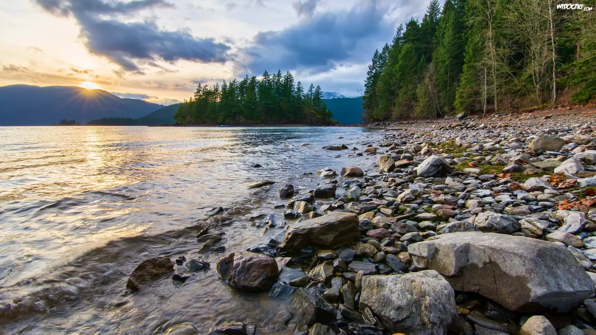 Park prowincjonalny Sasquatch, Kolumbia Brytyjska, Kanada, Kamienie, Jezioro Harrison Lake, Drzewa, Promienie słońca |
