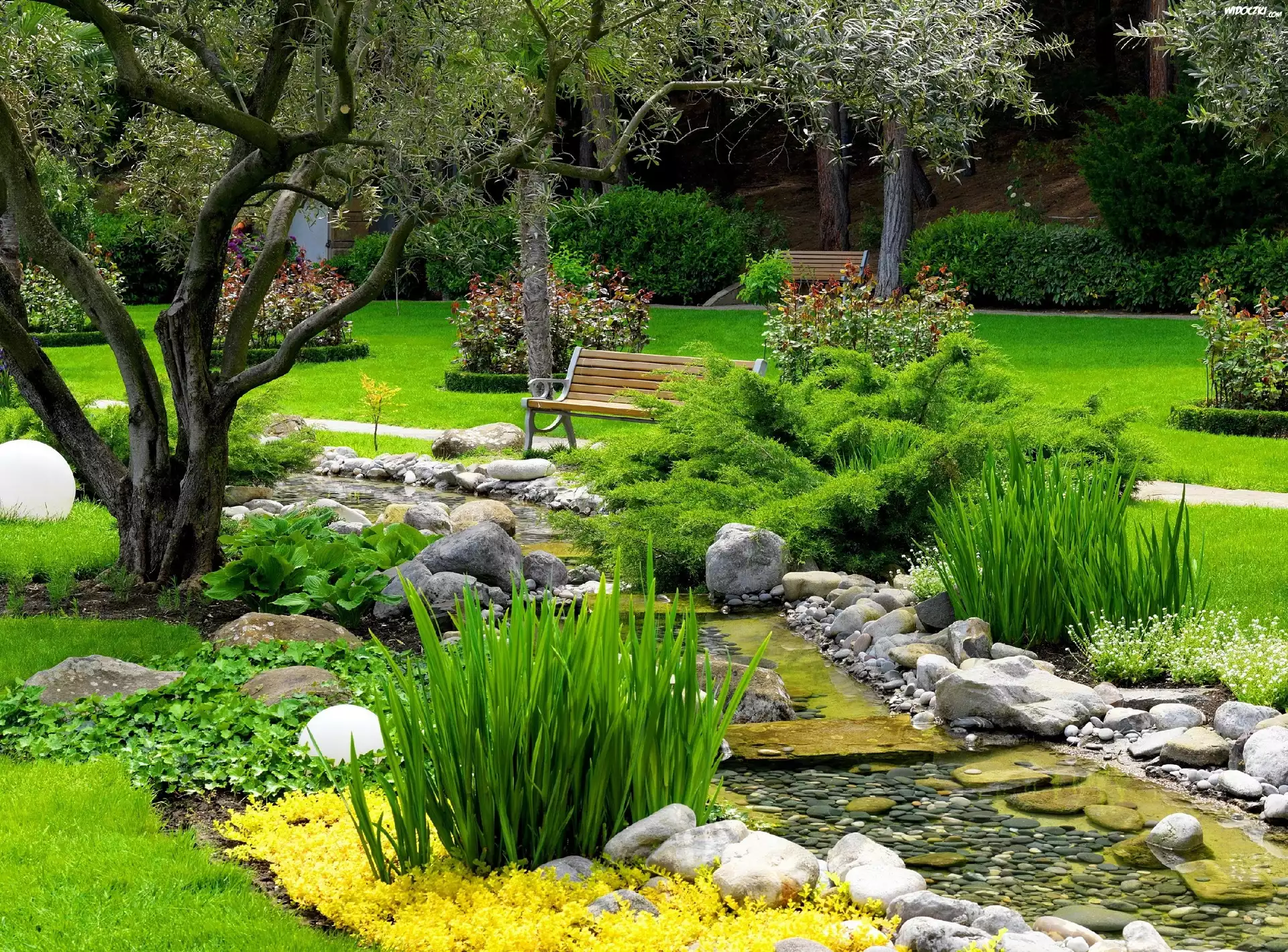 Zdjęcia, Park, Ławka, Krzewy, Strumyk