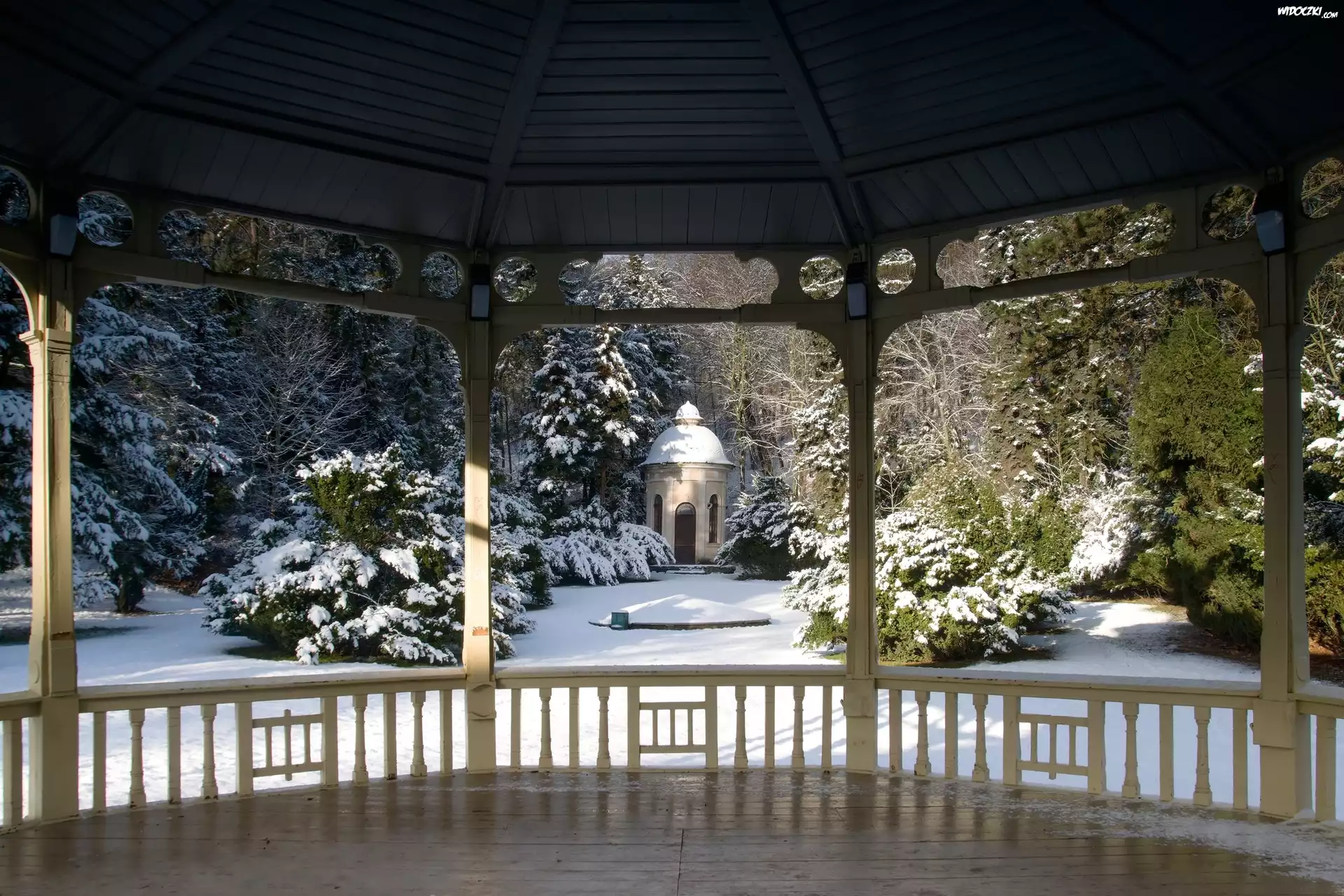 Zdjęcia, Park, Altana, Drzewa, Krzewy, Zima