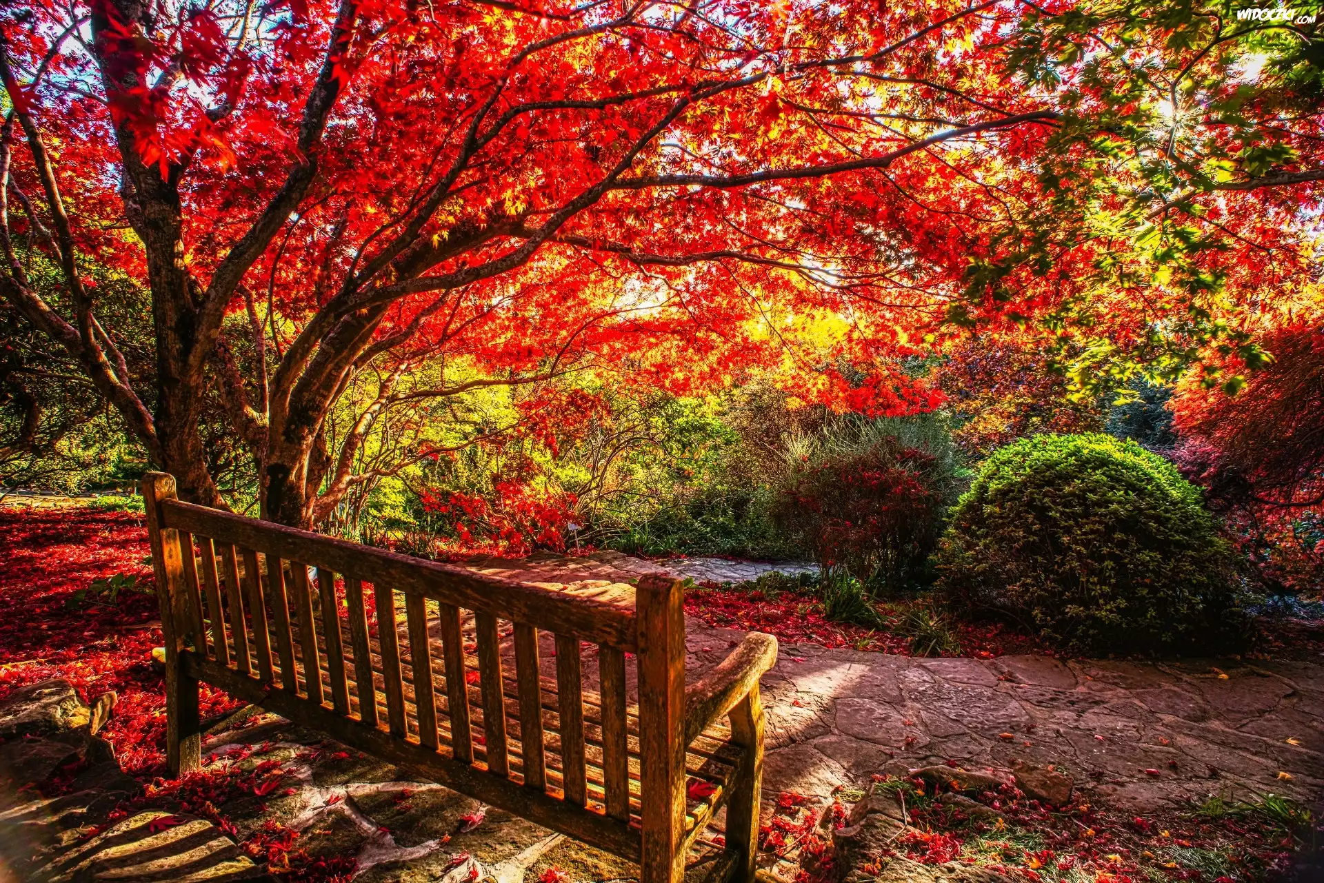 Park, Jesień, Drzewa, Krzewy, Ławeczka