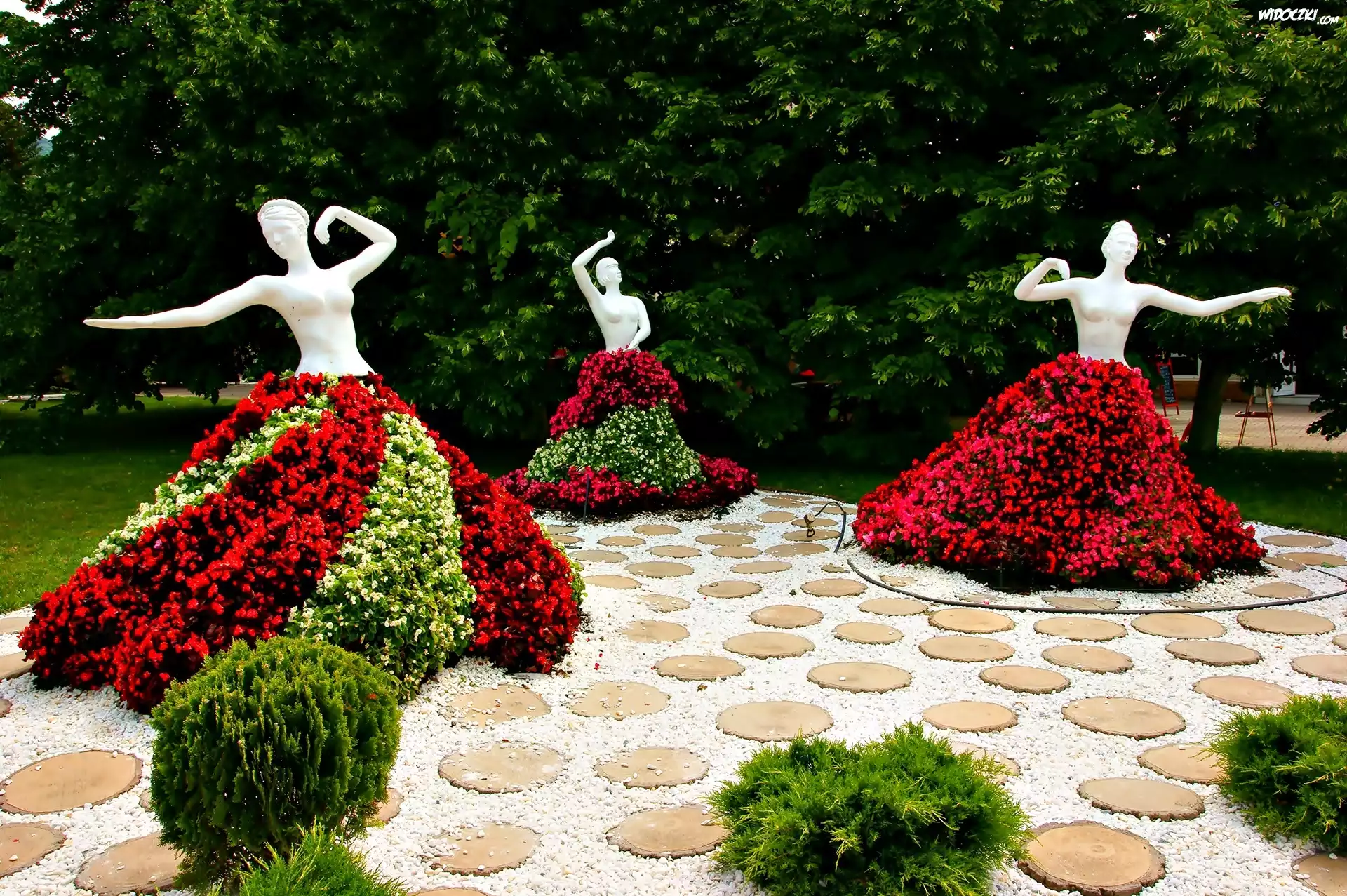 Zdjęcia, Park, Kwiaty, Klomby, Figurki, Krzewy, Drzewa