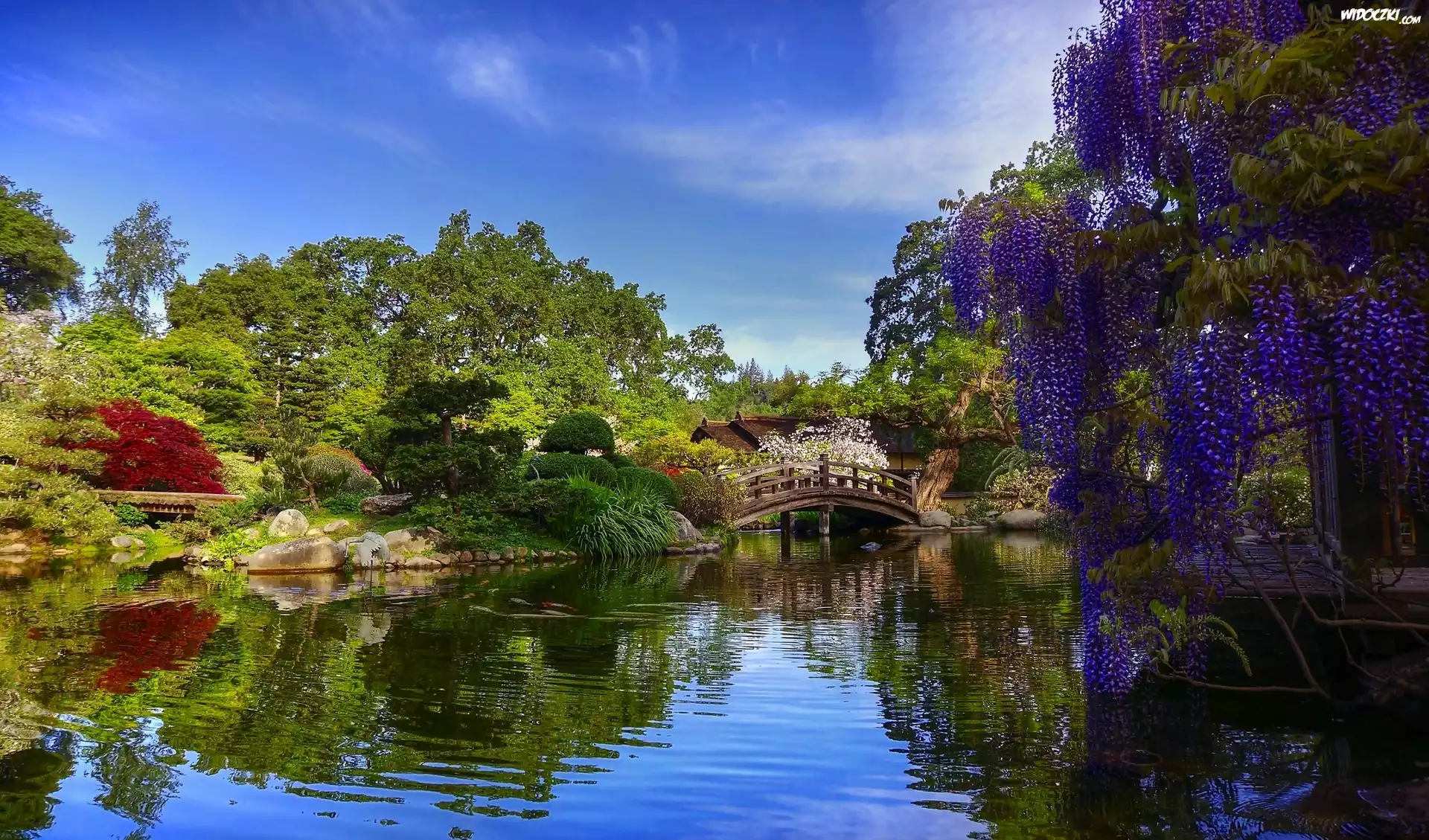 Zdjcia, Park, Staw, Mostek, Krzewy, Drzewa